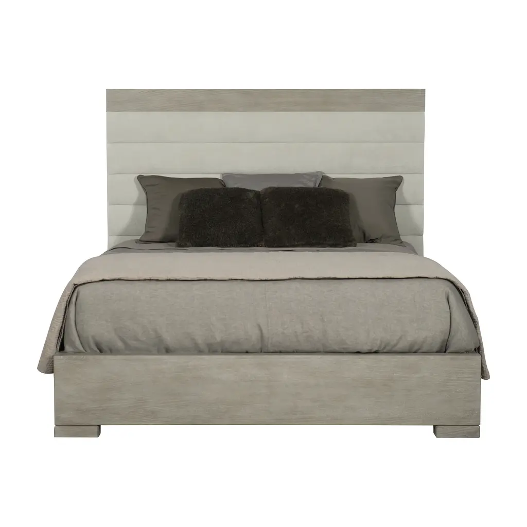 With its flawless artistry and understated elegance, Linea sets a new standard for rustic modern collections. The Linea channel bed pairs complementary neutral tones in a sophisticated contemporary design. The wood-framed headboard features a beige upholstered panel with five horizontal channels. The oak veneers have been wire brushed and cerused, adding subtle textures while leaving a white hang-up in the grain. Features