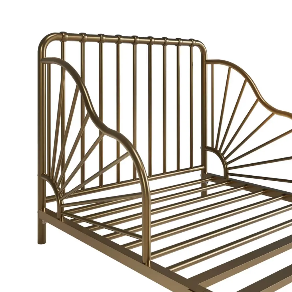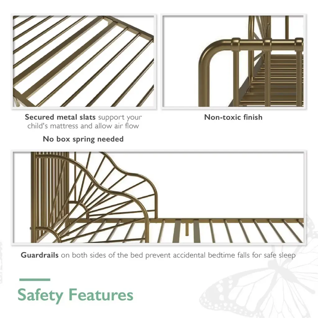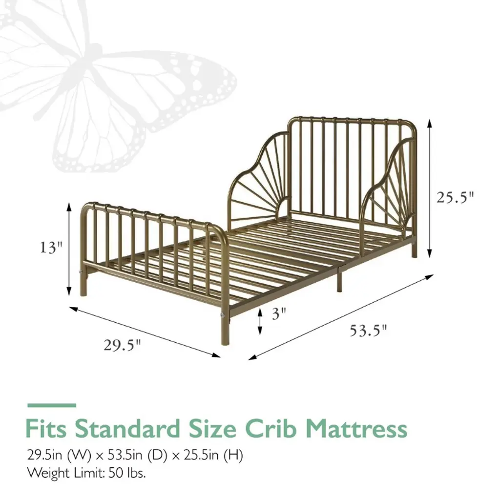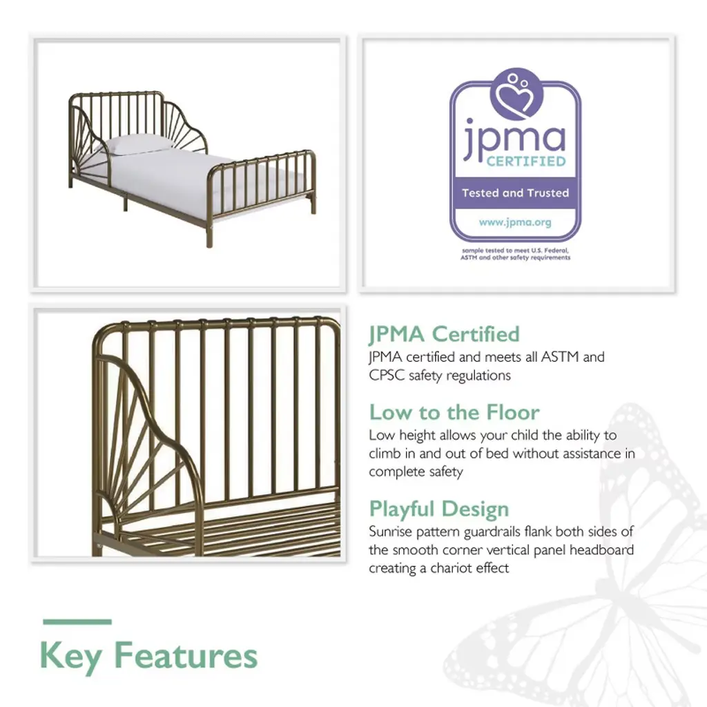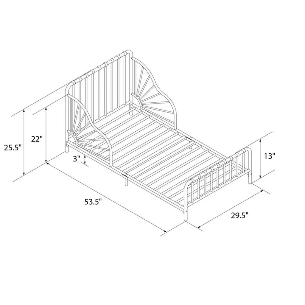 Every dream is bound to be sweeter than the last while sleeping on the Little Seeds Quinn Whimsical Metal Toddler Bed that gives any little boy or girl transitioning out of the nursery crib phase the ideal low-profile height for climbing in and out of bed without assistance. Adorned by ornate rings on the outer rim of the tubular vertical slats lining the rounded corner headboard and footboard, this fanciful toddler bed features sloped dual-sided safety rails with cheerful sunrise detailing that will put a smile on your kid's face while preventing worrisome bedtime falls. The robust metal platform frame with center legs and metal slatted base with side rails will provide consistent support to keep your child's mattress secure (standard size crib and toddler bed mattress not included). A thoroughly safe bed for toddlers, the Quinn comes in attractive non-toxic finishes and has been JPMA certified and met all relevant ASTM and CPSC safety specifications. Give your children a fanciful and dreamy space to rest where their imagination flourishes.