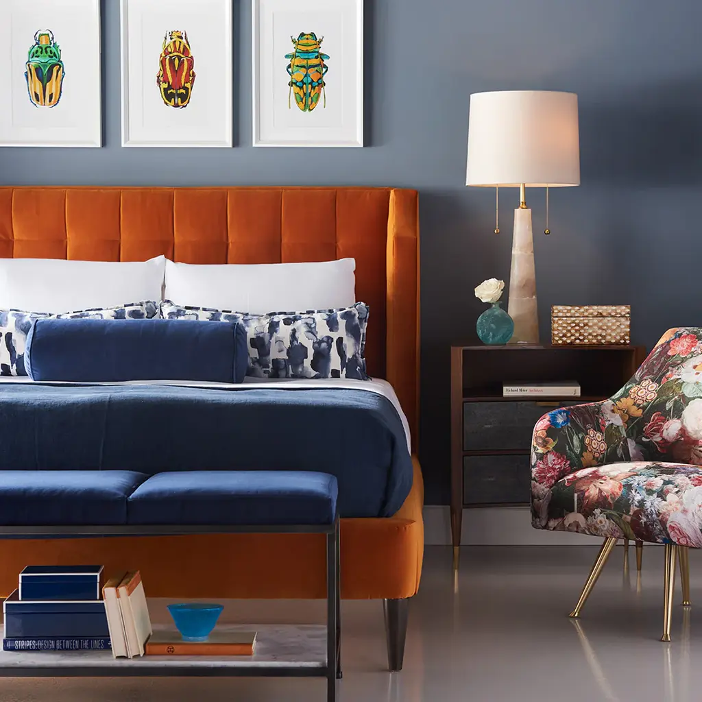 Contemporary chic with a splash of Mid Century Modern flair, the Lola Bed features an entirely upholstered frame with wooden tapered legs. The tufted headboard gives extra texture to any bedroom. Includes a bunkie board base. Ships In 8-10 Weeks Channeled fabric headboard Fully upholstered As Shown Fabric: Diamond Orange As Shown Finish: Cinder If you choose to purchase COM, once you have placed your order a customer service rep will contact you regarding where to send your fabric. Please note that current lead time is 17-19 weeks once your fabric arrives at the factory, and if unused fabric is under 1.5 yards, it cannot be sent back to you.This product can be special ordered in additional fabrics, leathers, finishes, and cushion fillings. Click here to email us for for additional information about special ordering.This image is for illustrative purposes only. The colors shown are accurate within the constraints of lighting, photography, and the color accuracy of your screen.
