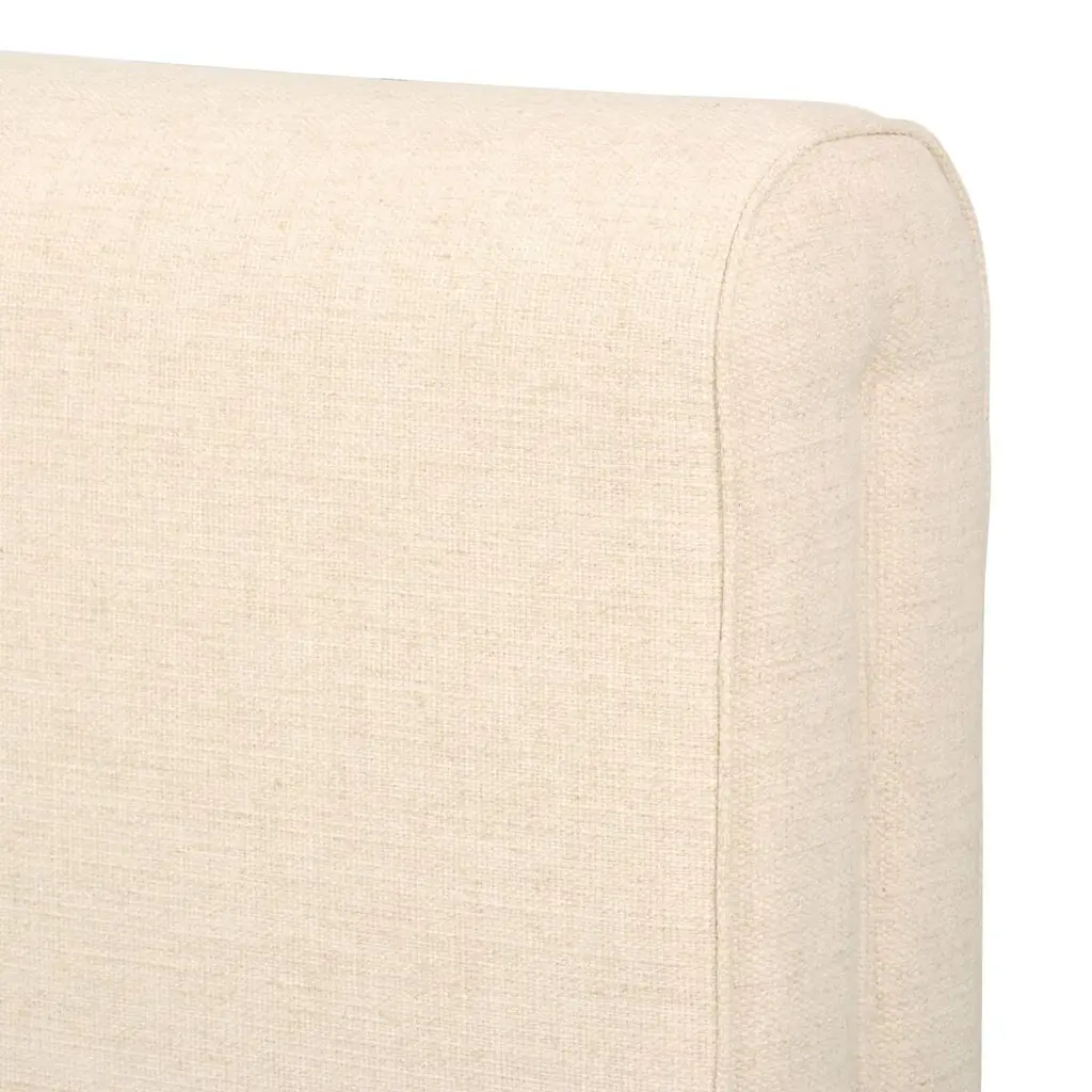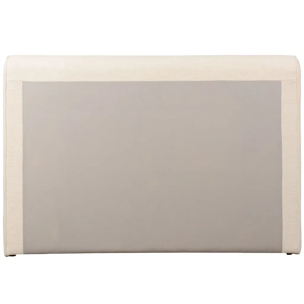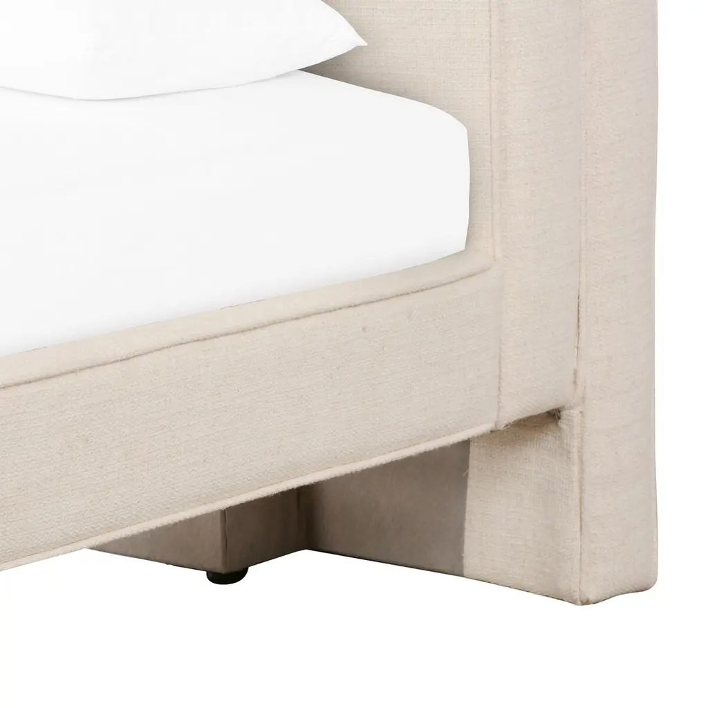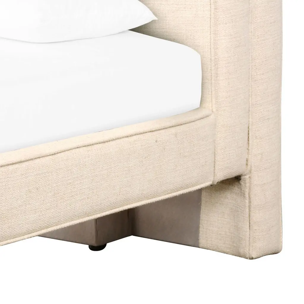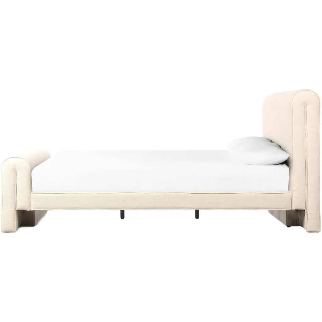 This bed's "folded" headboard and footboard call to mind mod '60s style, but the cream color of the stain-resistant upholstery gives it a timeless finesse. Generous cushioning makes the headboard a pleasure to lean against when reading or watching TV.
