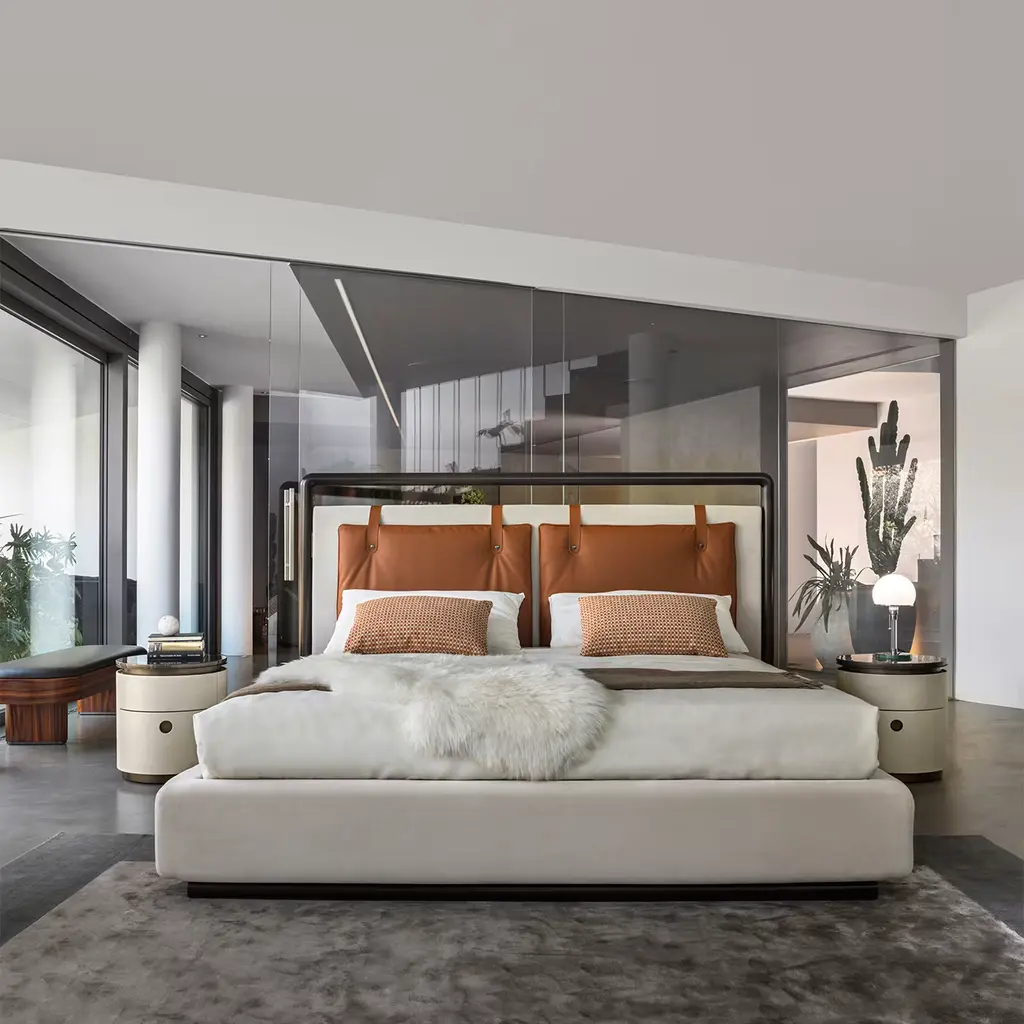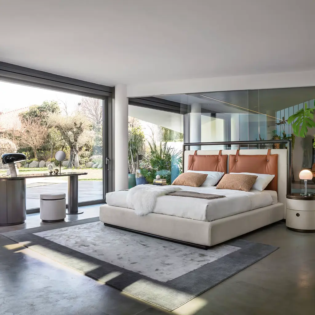 Named after the renowned museum in Paris, this spectacular bed is distinguished by timeless elegance and refinement. Crafted of lightened MDF with a solid wood frame and matte dark beechwood footboard, it is enriched with softly padded headboard cushions, upholstered with fine leather. The structure is filled with multi-density polyurethane foam, lined with polyester wadding, and upholstered with fabric. Bed linen and decorative pillows on request, please contact the Concierge for details.