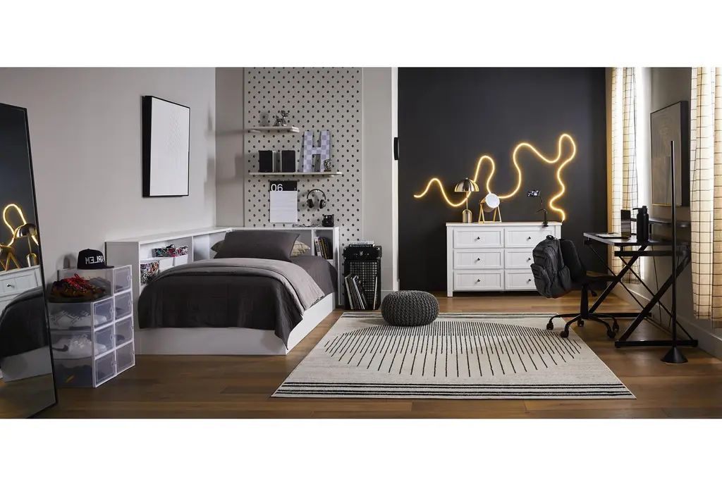 Introducing the Luca White Twin Wood Corner Bookcase Bed, a perfect addition to any kid's room. This contemporary captain bed is designed for small spaces and provides ample storage with its integrated shelves and bookcase. Crafted from solid pine and MDF, it ensures durability and functionality without the need for a foundation.
