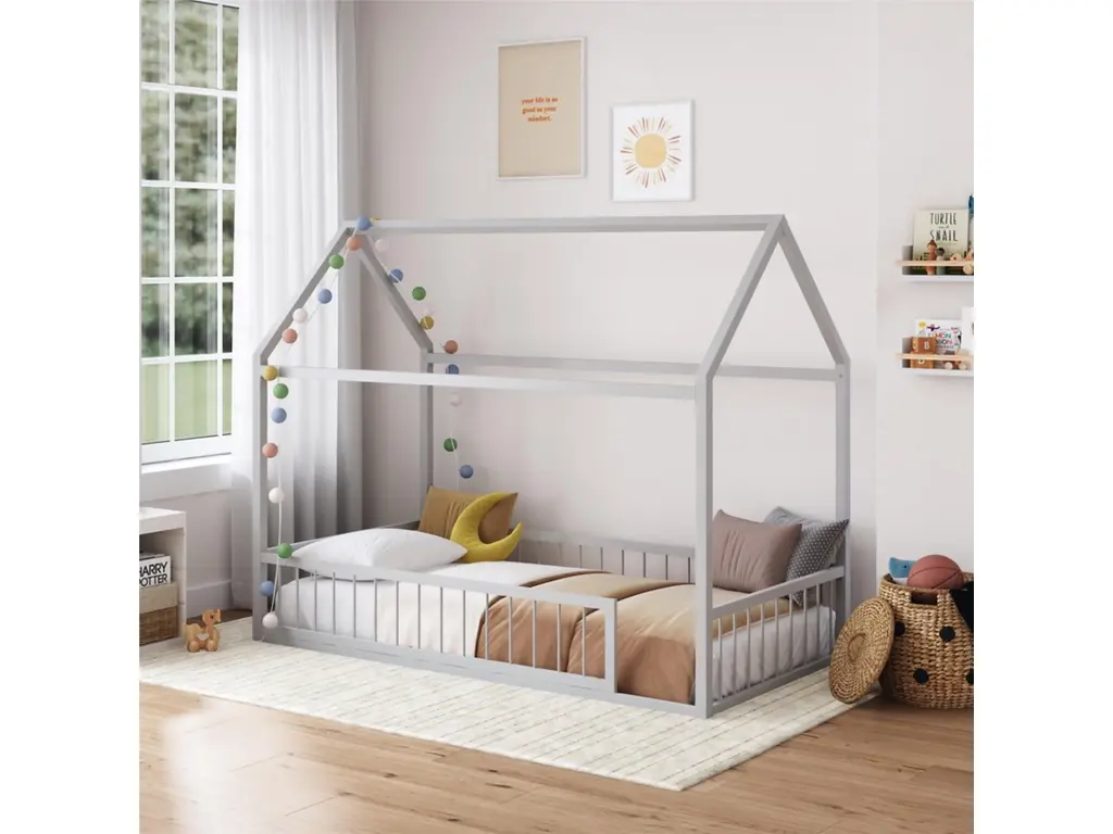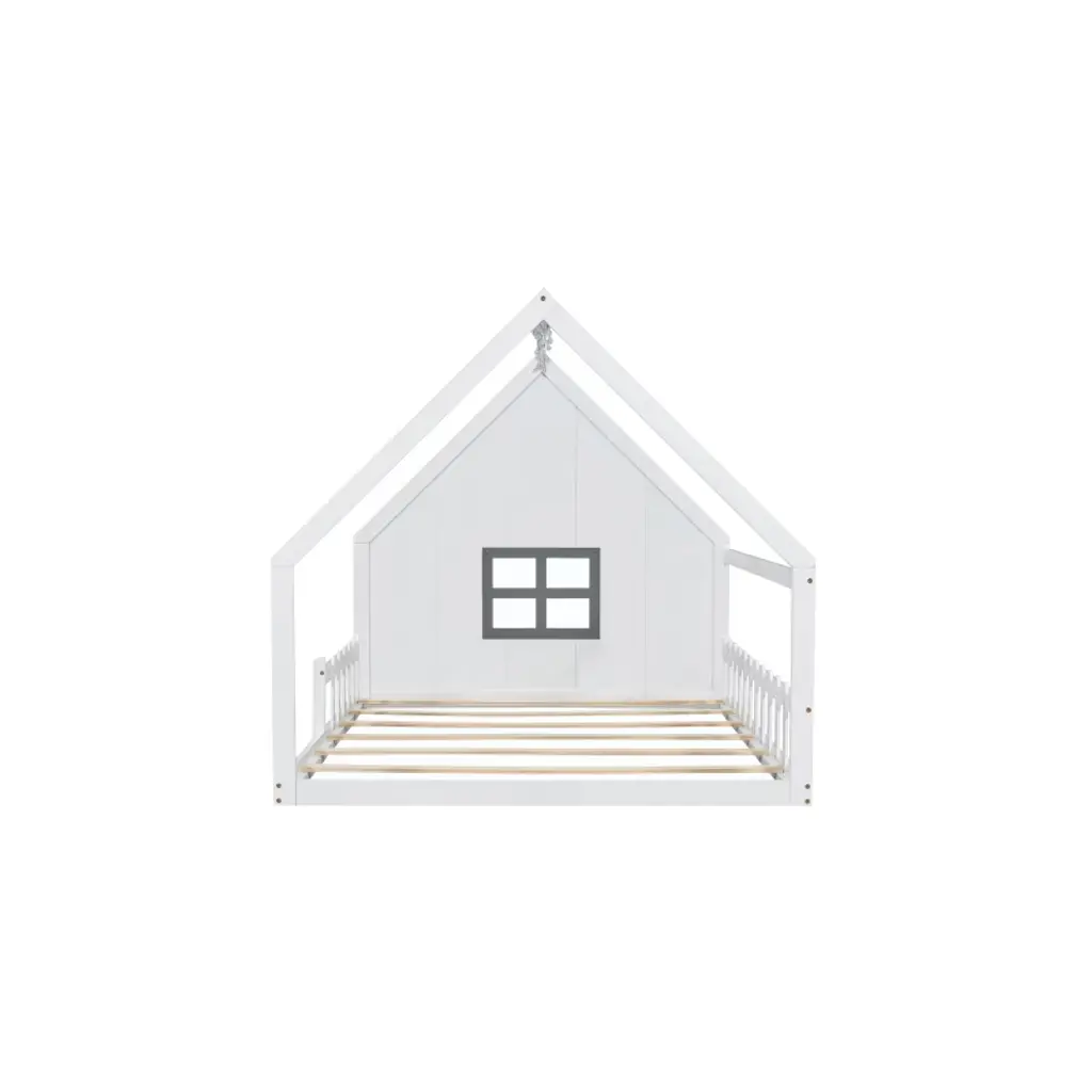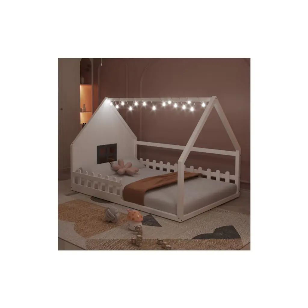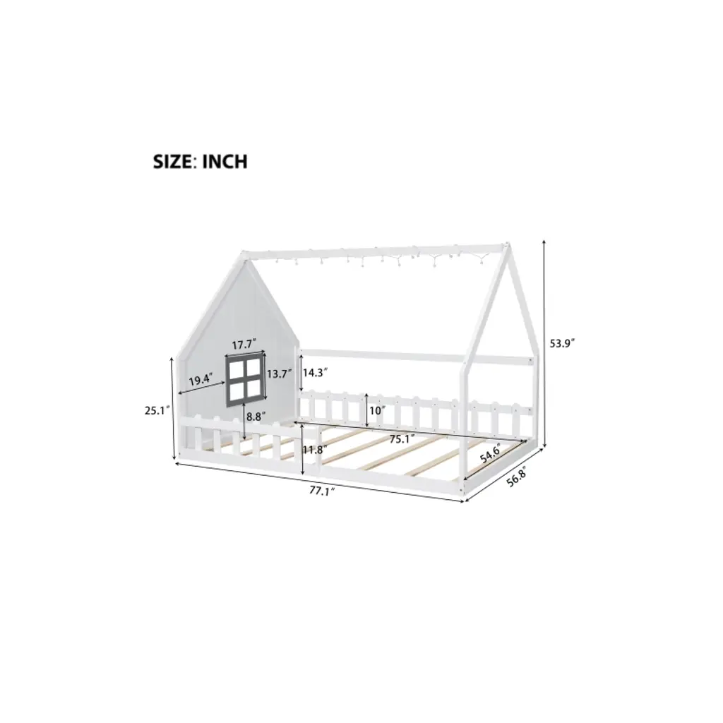 Turn your child's bedroom into a magical, safe space with this Full Size Wood House Bed Frame— a whimsical yet durable piece that blends sleep, play, and style. Finished in a versatile white hue, its house-shaped frame (complete with a fence and window) adds a cozy, rustic country feel to any decor while sparking your kid's imagination—decorate it together to create their personal “playground.” Crafted from solid pine wood and MDF, the Bed Frame is sturdy, high-load-bearing, and built to last through years of bedtime and playtime. It includes a fun LED light that wraps around the bed's roof, adding a decorative glow and encouraging creative play. Designed as a floor bed, it requires no box spring, simplifying setup, and the fence-style guardrails provide safety for active kids. This isn’t just a Bed Frame—it's a space where your child can sleep, play, and dream freely.