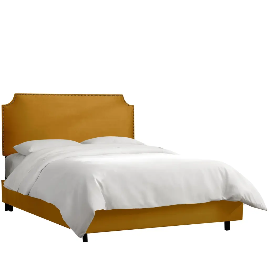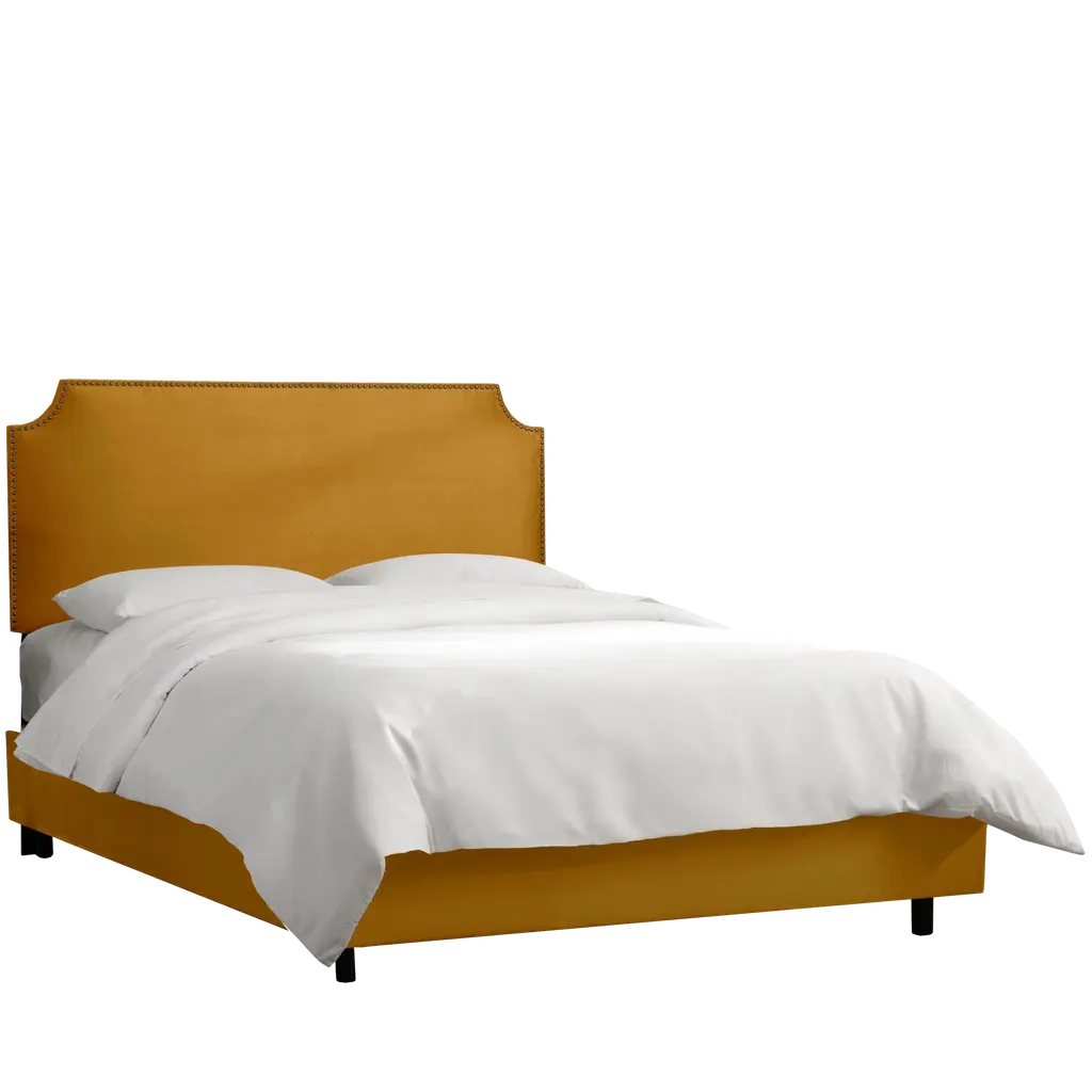 Designed with scalloped corners on the headboard, this upholstered bed offers an elegant, timeless look. Enhance your bedroom instantly with this inviting centerpiece. The edge of the headboard is finished with nailheads for added refinement. This item is made to order.