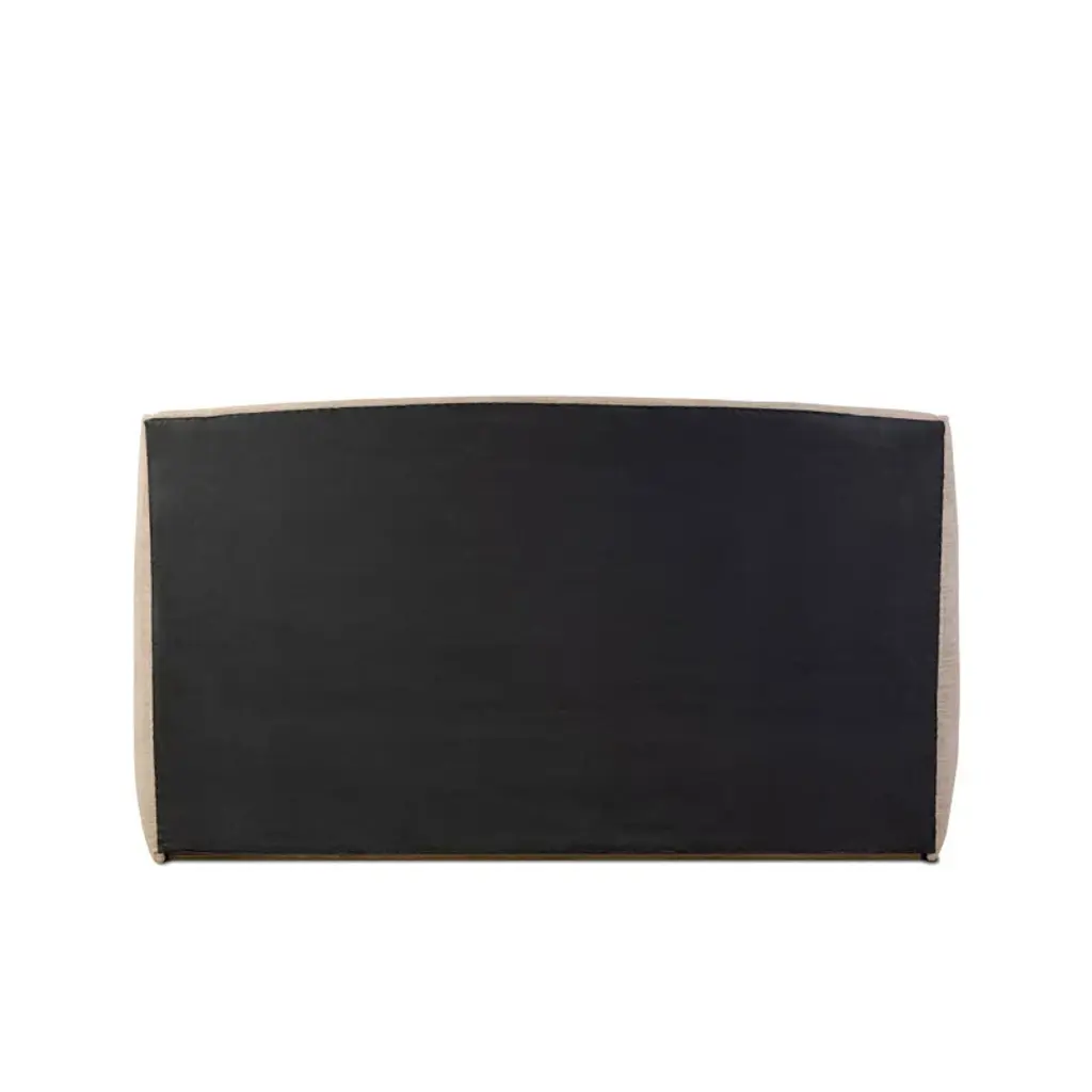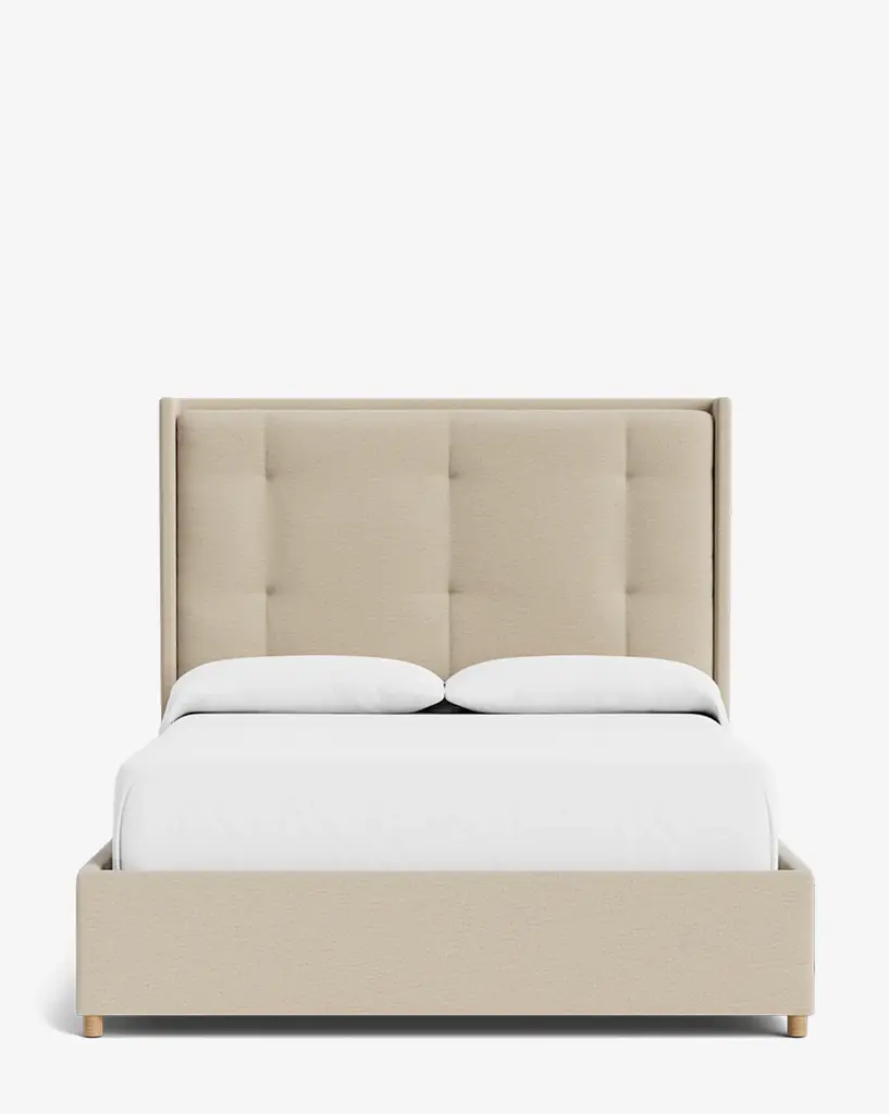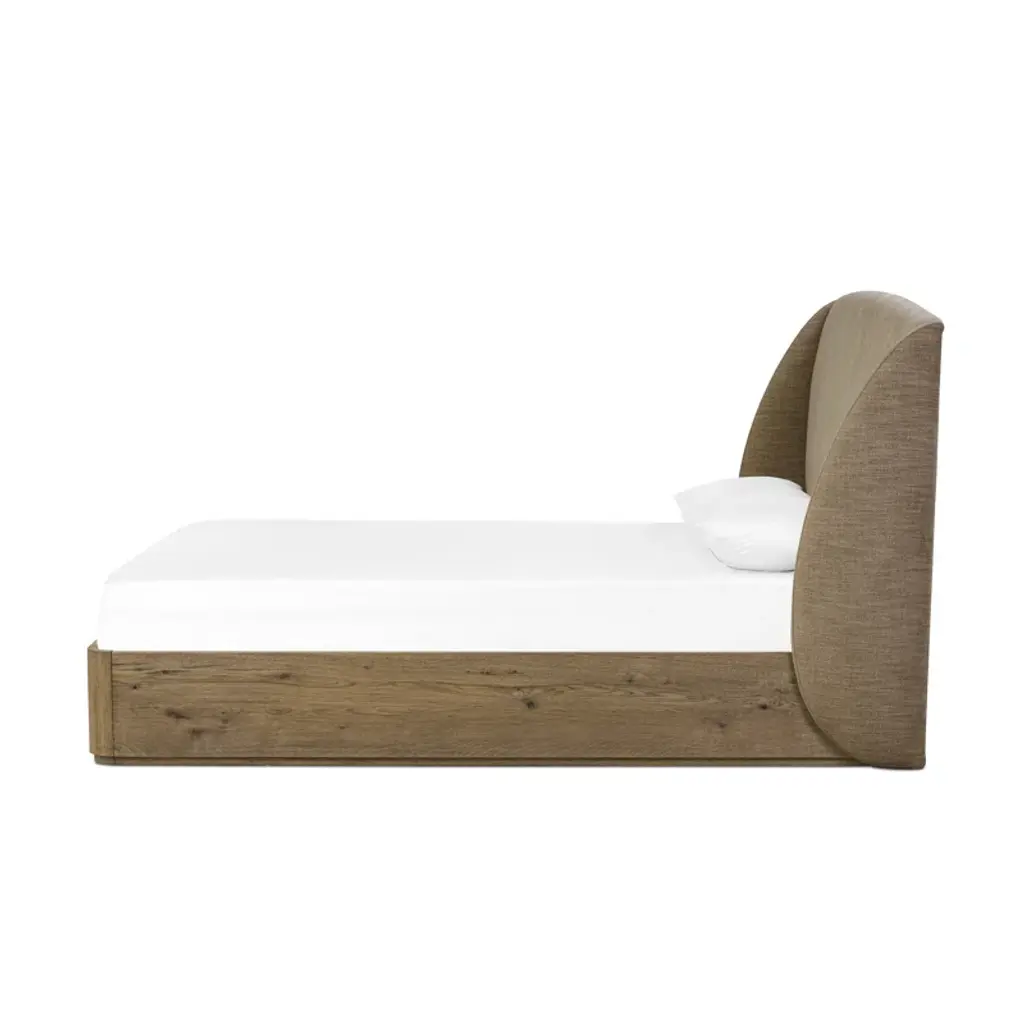 Clean lines meet contoured curves for a timeless bedroom look. A petal-shaped shelter overlaps side rails for a unique, comforting silhouette. Fully upholstered in a versatile taupe that complements a wide range of color palettes, all grounded by a rich oak base.