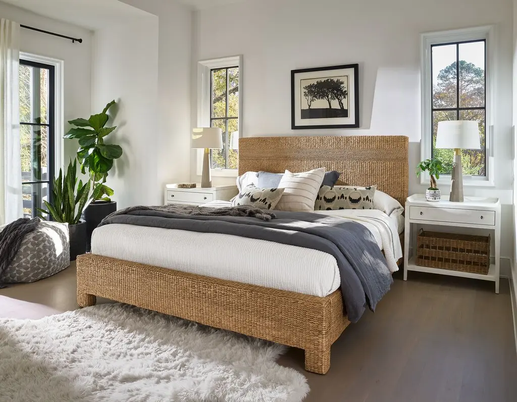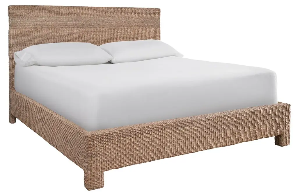 This bed is the next-best thing to sleeping in an overwater bungalow in the tropics. The sturdy hardwood frame is wrapped in woven water hyacinth; the headboard includes a band of woven abaca for more textural interest. The bed can accommodate a mattress with or without a box spring.