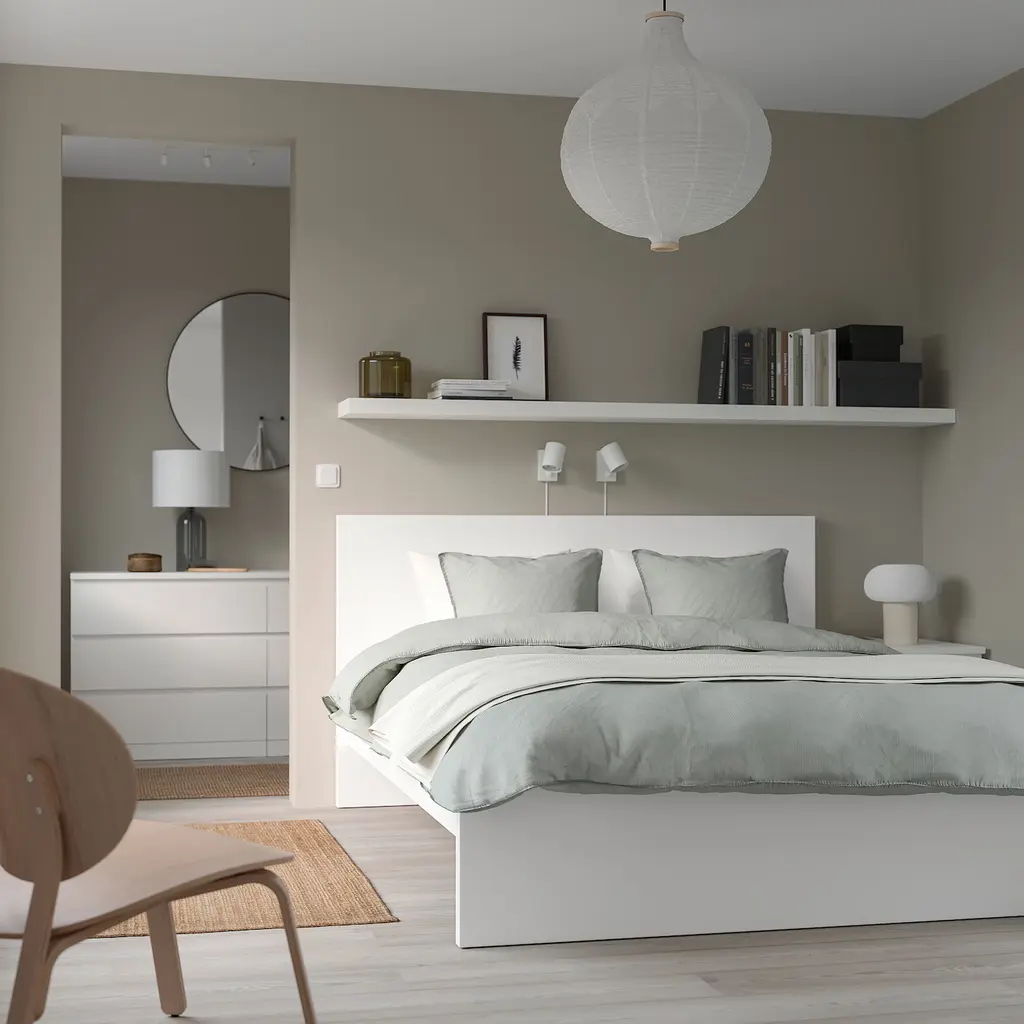 MALM Bed frame with mattress - white/Valevåg firm Queen. Adjustable bed sides allow you to use mattresses of different thicknesses. This versatile bed frame will look great with your choice of textiles and bedroom furniture. Add 2 or 4 MALM bed boxes to create lots of extra storage space.