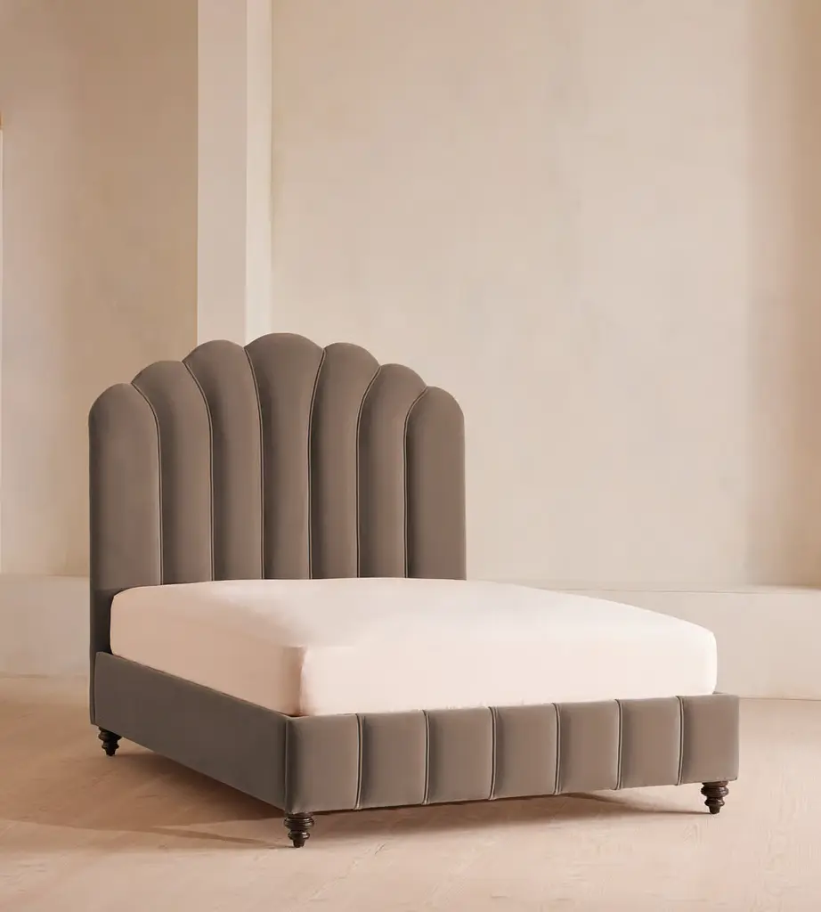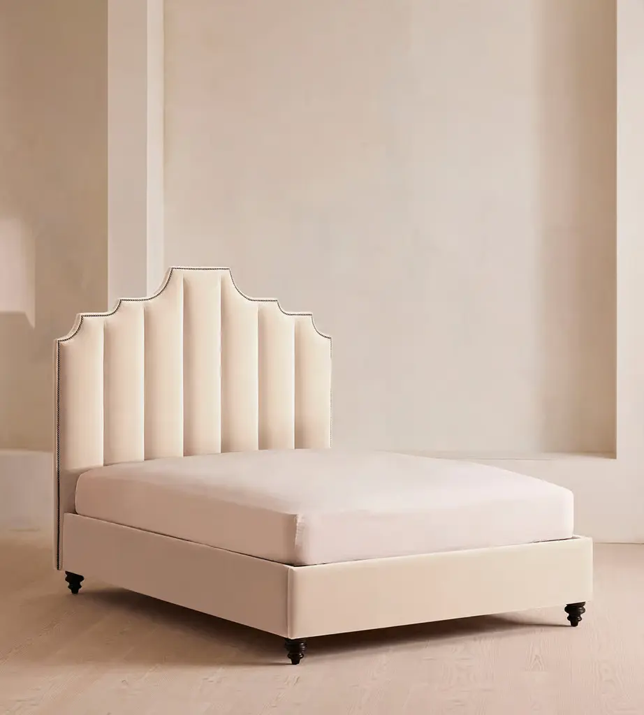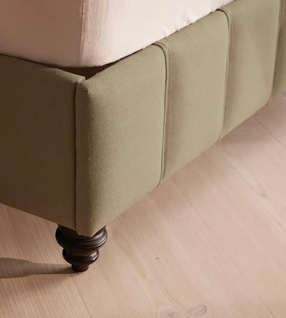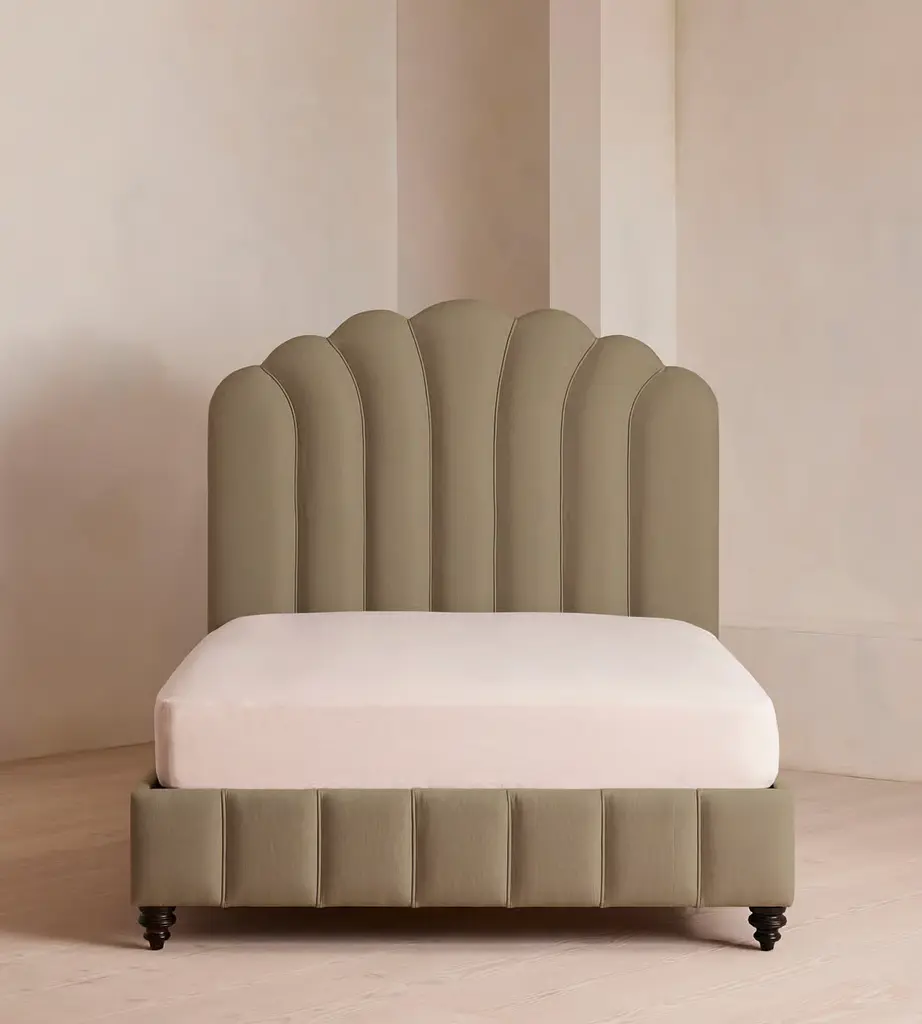 An Art Deco-inspired fan headboard with piping detail characterizes our Manette bed to create a focal point in your own bedroom. Handmade in the US by skilled craftsmen, it's upholstered in natural linen and draws influence from the cozy bedrooms of Kettner's in London. Resting on turned hardwood feet for added depth and texture, this particular style sits low to the floor for ease and comfort.