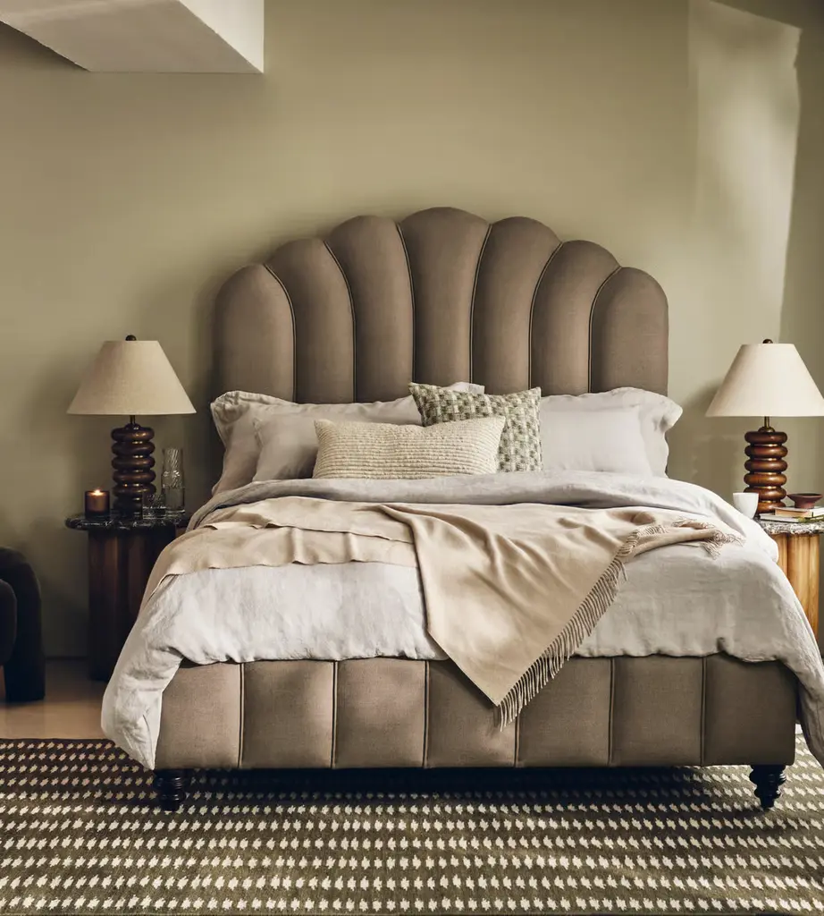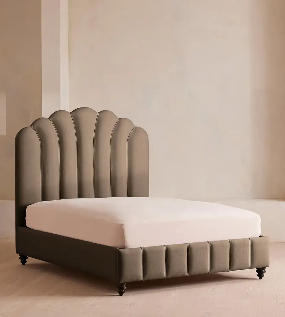 An Art Deco-inspired fan headboard with piping detail characterizes our Manette bed to create a focal point in your own bedroom. Handmade in the US by skilled craftsmen, it's upholstered in natural linen and draws influence from the cozy bedrooms of Kettner's in London. Resting on turned hardwood feet for added depth and texture, this particular style sits low to the floor for ease and comfort.