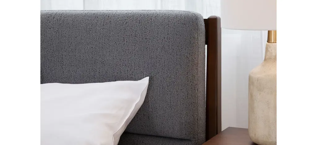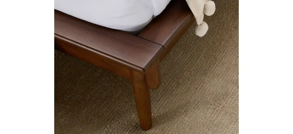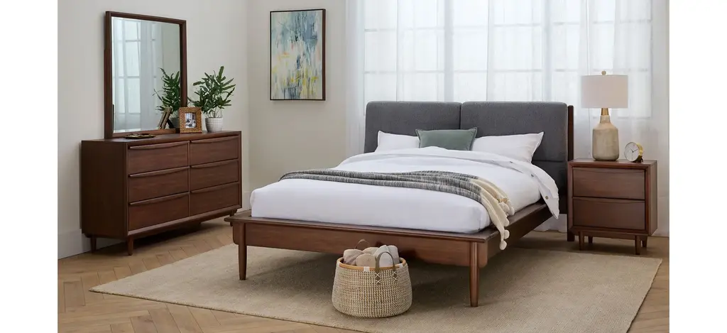 Wake up to modern midcentury style with the Marcelo queen upholstered platform bed. The handsome collection features a rich walnut finish and sleek silhouette. The dual pillowed upholstered headboard brings updated comfort to the platform bed, while the architectural ledge and tapered outer posts add distinction.