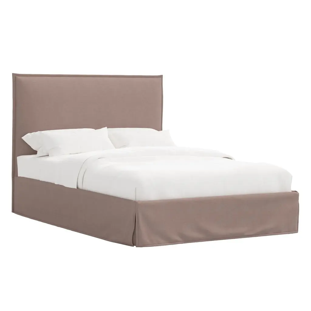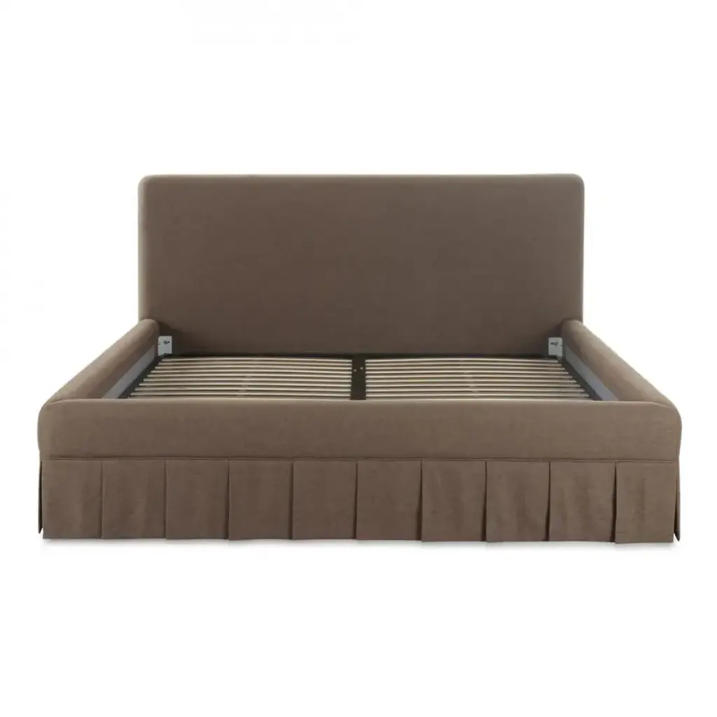The Maren king bed exudes a soft, feminine aesthetic, upholstered in a warm, neutral fabric and featuring a playful yet refined box pleat base reminiscent of vintage finesse, straddling the line between contemporary form and traditional finish. With smoothly rounded corners and graceful, curving forms adding softness to the design, this piece is a study in elegance and subtlety.