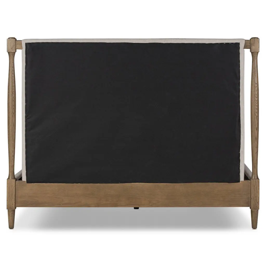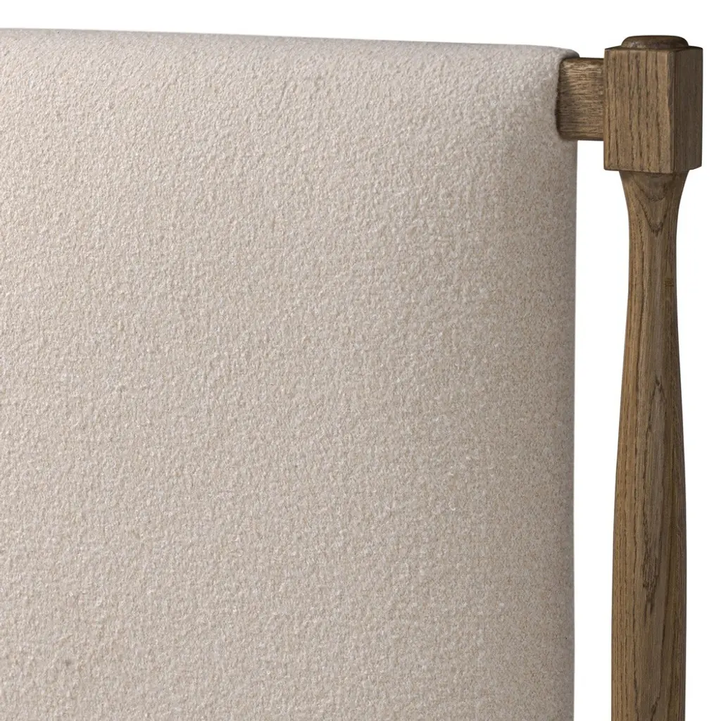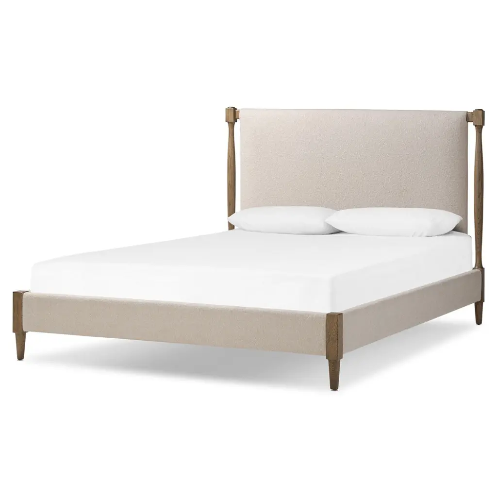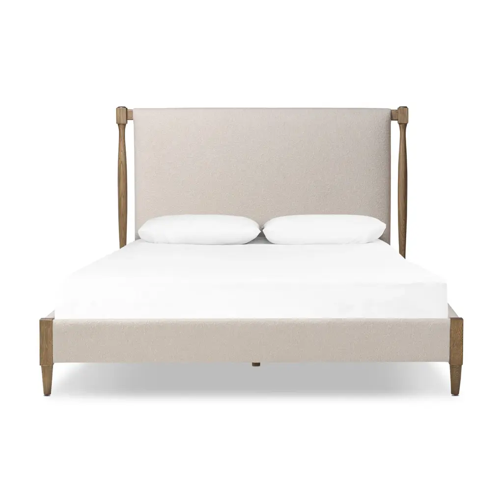 A design collaboration by Amber Lewis and Four Hands. Traditional turned legs extend from the floor to the headboard of this upholstered bed, bringing a light and airy feel to the bedroom. Legs and frame are crafted from oak in a medium brown finish. Upholstered in a soft, cream boucle fabric with the look of brushed wool.