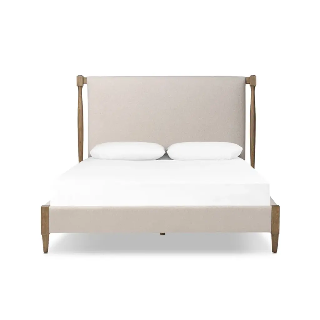 A design collaboration by Amber Lewis and Four Hands. Traditional turned legs extend from the floor to the headboard of this upholstered bed, bringing a light and airy feel to the bedroom. Legs and frame are crafted from oak in a medium brown finish. Upholstered in a soft, cream boucle fabric with the look of brushed wool.