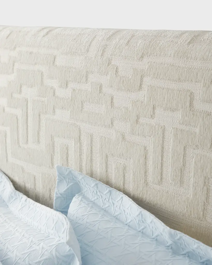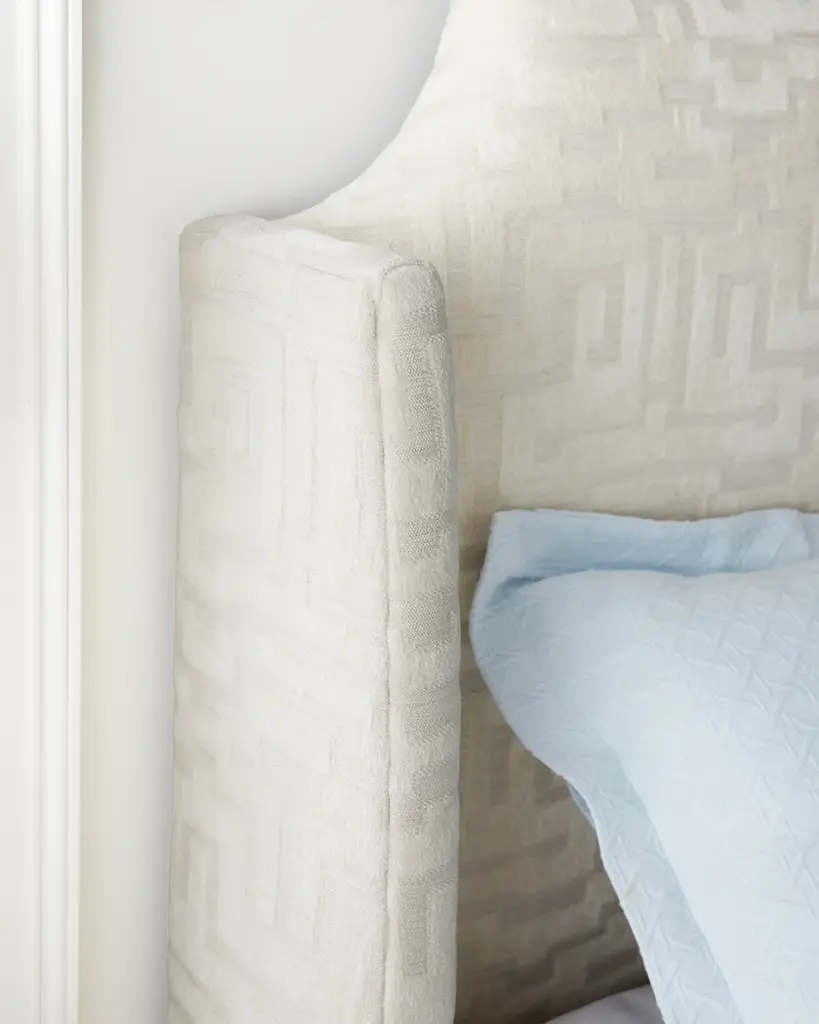 This wingback bed features a geometric pattern in the upholstery Handcrafted of engineered hardwood Upholstery, polyester/cotton Overall, approx. 87"W x 85"D x 60"T Space for mattress/box spring, 77"W x 81"D Assembly required; includes hardware Finished back Weight, 330.0 lbs Made in USA Boxed weight, approximately 340.0 lbs Shipping Direct from Vendor, usually ships within 60 business days. About Massoud: Company president Chuck Massoud's father combined his entrepreneurial spirit with loans from three friends to start Massoud Furniture in 1963. Since then, the Massoud family has been crafting its distinctive brand of custom seating. Massoud is credited for putting pitch in their wing chairs—leaning them back slightly makes them so much more comfortable than the classic wing chair with a straight back. All Massoud furniture features kiln-dried hardwood frames and the finest leathers and fabrics available. They also employ multiple support rails, reinforced corner blocks, mortise-and-tenon joinery, and suspended coil systems for comfort and quality craftsmanship that lasts a lifetime.