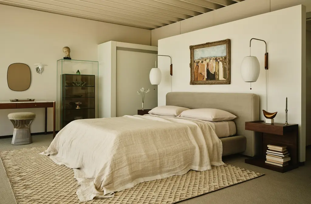 The Mesa Collection blends the clean lines and organic forms of midcentury modern design with the warm and inviting ethos of California living. With its fully upholstered backboard and frame, the Mesa Bed (2016) introduces even more softness to the bedroom. Intricate finishes, such as the stitching at the border of the headboard, add subtle character. A deep inset base in American walnut or white oak gently elevates the frame, suggesting levitation. Choose from a range of high-quality fabrics, including tactile weaves, rich velvets, and sturdy linens that invite touch and enhance comfort. Made in Mexico.