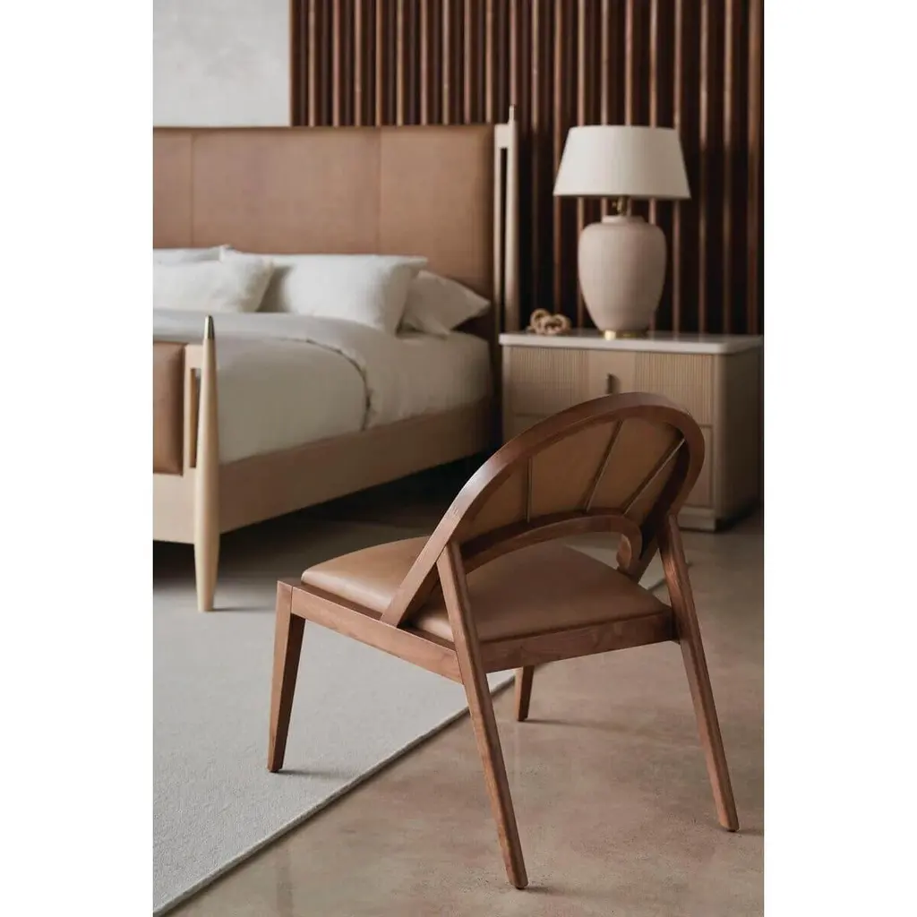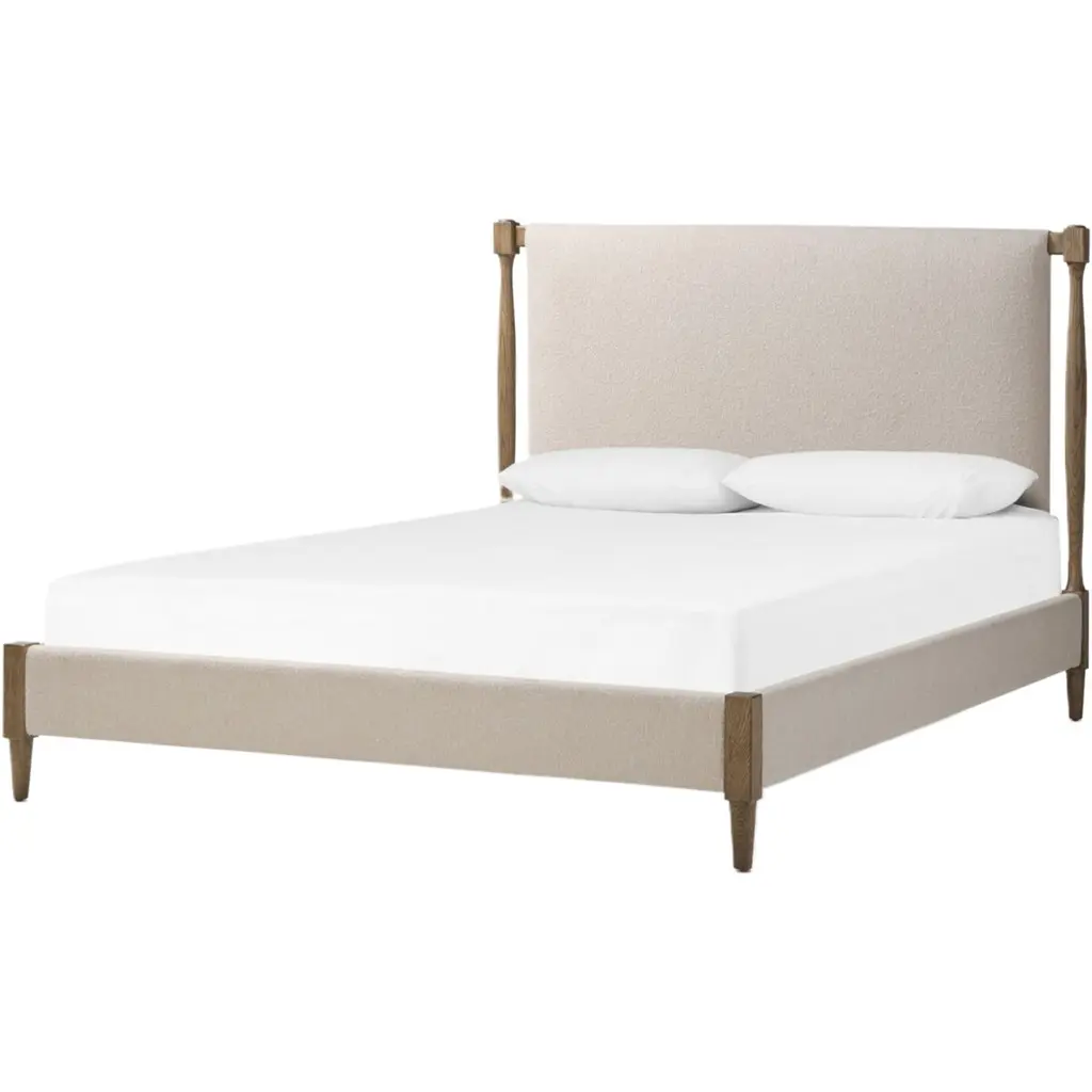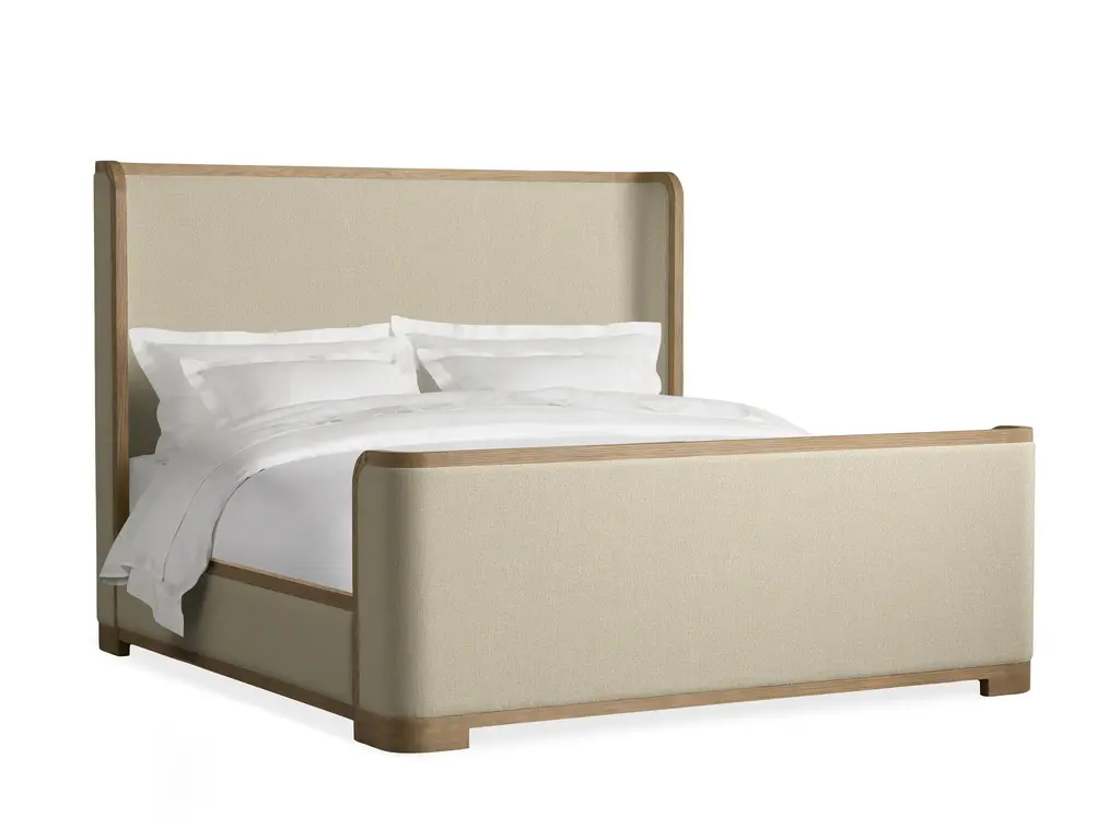 With simple modern lines and a rich use of material, the bed brings a simple yet sophisticated cadence to bedroom interiors. Tailored in a lavish, camel-colored leather, its clean, parsons-style headboard warmly complements a Sun Drenched Oak wood frame. Metal finials in a Lucent Bronze finish accentuate subtly tapered posts with a note of luxe.Dimensions: 64.5" W x 87" D x 58" HFeatures:Upholstered headboard and footboard.Wood siderails finished in Sun Drenched Oak.Metal finials on headboard and footboard in Lucent Bronze Oak.Removable slat supports to accommodate adjustable bed frame.15-piece slat system with 1 center rail.