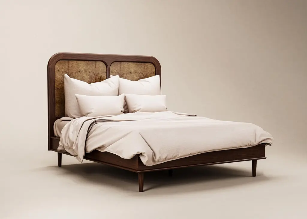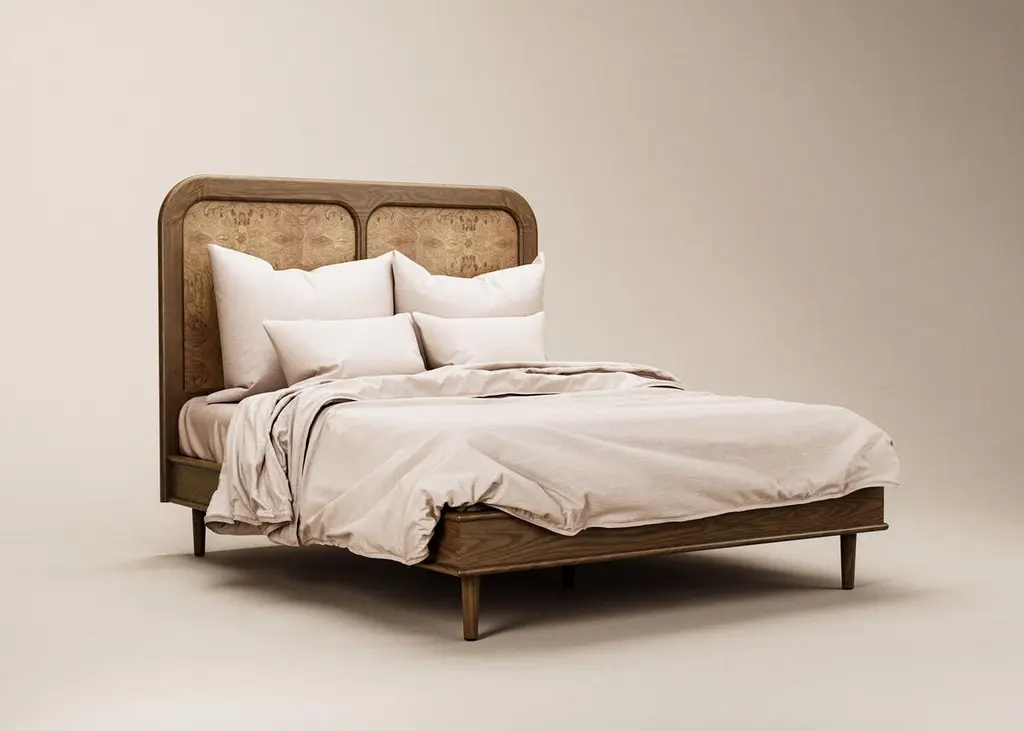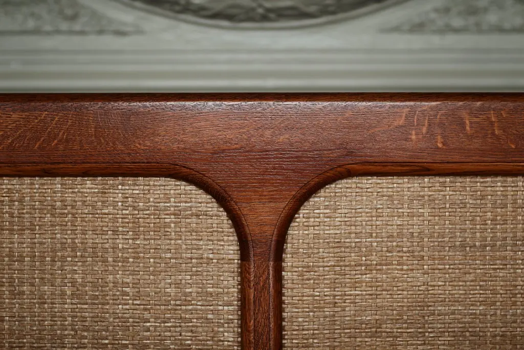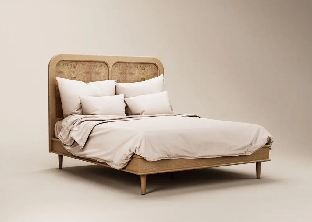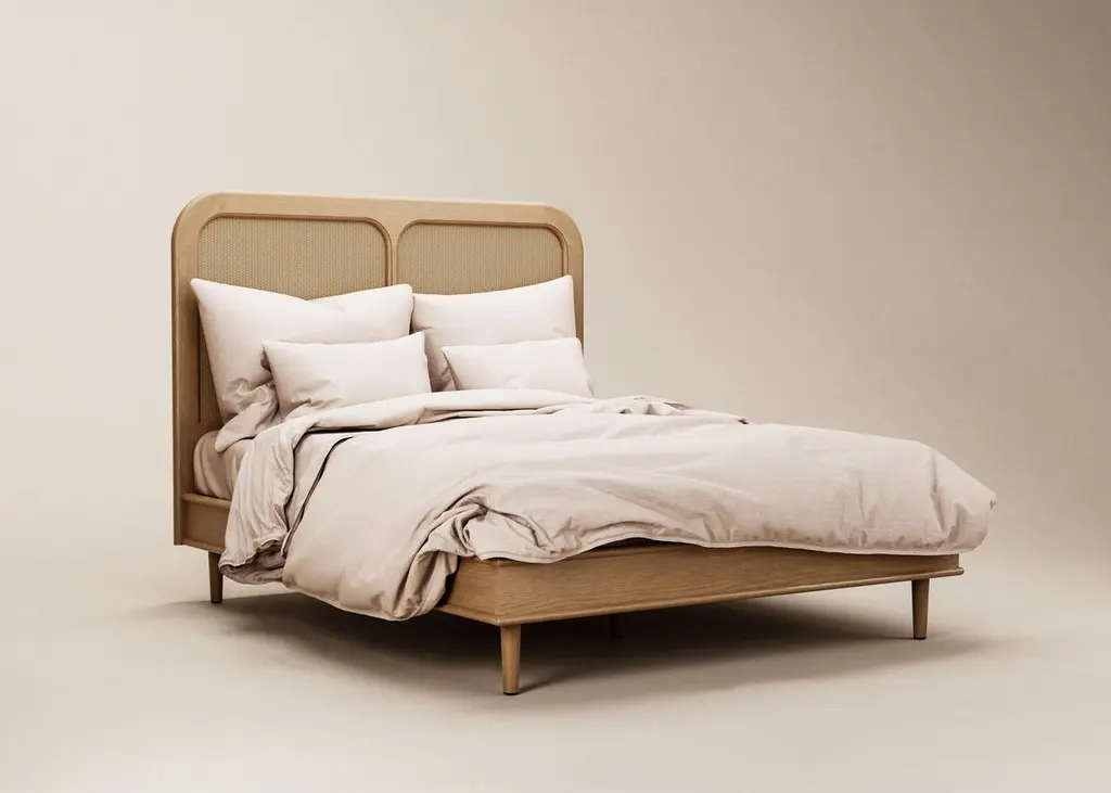 A bed in European oak and rattan, developed especially for Sanders, Copenhagen's premier luxury boutique hotel.Hand crafted to order in Europe.———Euro DoubleHeadboard — 1546 mm (W) x 62 mm (D) x 1450 mm (H)Base — 2122 mm (L) x 1488 mm (W) x 380 mm (H)To fit mattress — 2000 mm (L) x 1400 mm (W)Euro KingHeadboard — 1746 mm (W) x 62 mm (D) x 1450 mm (H)Base — 2122 mm (L) x 1688 mm (W) x 380 mm (H)To fit mattress — 2000 mm (L) x 1600 mm (W)Euro Super KingHeadboard — 1946 mm (W) x 62 mm (D) x 1450 mm (H)Base — 2122 mm (L) x 1888 mm (W) x 380 mm (H)To fit mattress — 2000 mm (L) x 1800 mm (W)Euro Mega KingHeadboard — 2146 mm (W) x 62 mm (D) x 1450 mm (H) Base — 2122 mm (L) x 2088 mm (W) x 380 mm (H) To fit mattress — 2000 mm (L) x 2000 (mm) W———USA QueenHeadboard — 65.2” (W) x 2.4” (D) x 57” (H)Base — 84.7” (L) x 63.3 (W) x 15” (H)Mattress — 80” (L) x 60” (W)USA KingHeadboard — 81.3” (W) x 2.4” (D) x 57” (H)Base — 84.7” (L) x 79.4” (W) x 15” (H)Mattress — 80” (L) x 76” (W)USA Californian KingHeadboard — 77.4” (W) x 2.4” (D) x 57” (H) Base — 84.7” (L) x 75.5” (W) x 15” (H)Mattress — 84” (L) x 72” (W)——— Can be produced to bespoke sizes for a surcharge. Please note - lead time is maximum. We often hold a small amount of stock which is available much quicker, please enquire. Please note - the headboard is designed to be attached to the wall via split batten for stability.