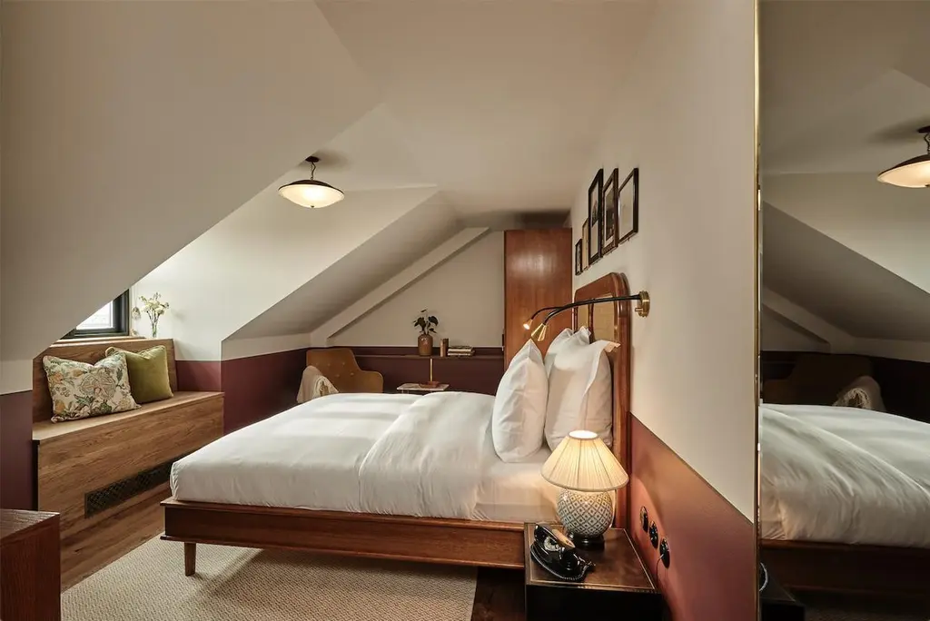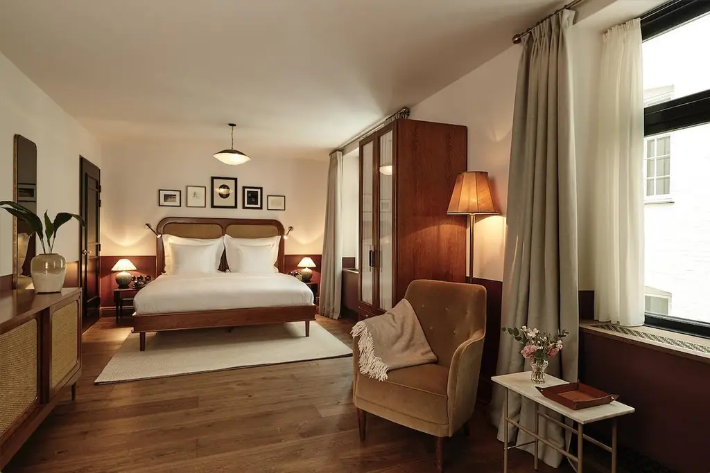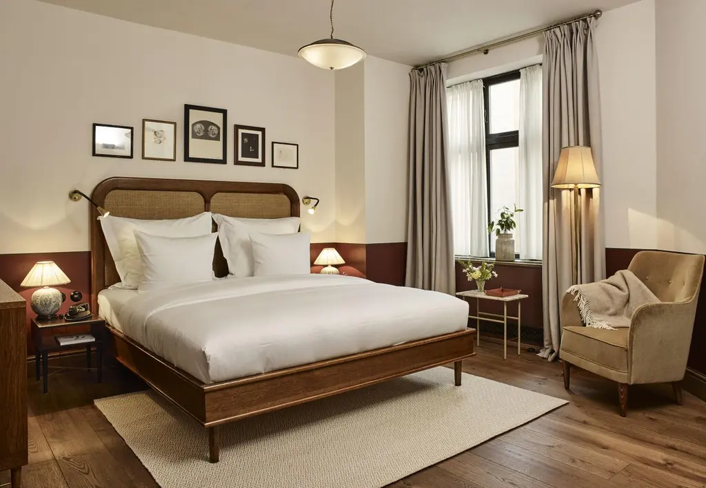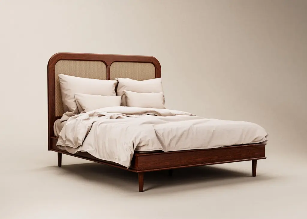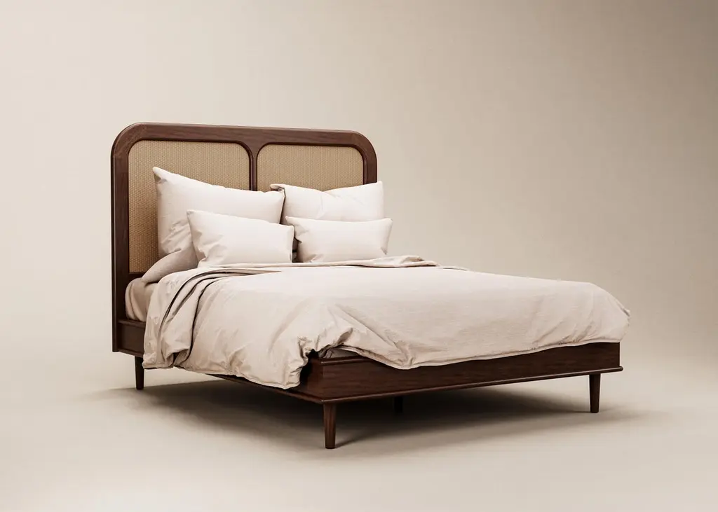 A bed in European oak and rattan, developed especially for Sanders, Copenhagen's premier luxury boutique hotel.Hand crafted to order in Europe.———Euro DoubleHeadboard — 1546 mm (W) x 62 mm (D) x 1450 mm (H)Base — 2122 mm (L) x 1488 mm (W) x 380 mm (H)To fit mattress — 2000 mm (L) x 1400 mm (W)Euro KingHeadboard — 1746 mm (W) x 62 mm (D) x 1450 mm (H)Base — 2122 mm (L) x 1688 mm (W) x 380 mm (H)To fit mattress — 2000 mm (L) x 1600 mm (W)Euro Super KingHeadboard — 1946 mm (W) x 62 mm (D) x 1450 mm (H)Base — 2122 mm (L) x 1888 mm (W) x 380 mm (H)To fit mattress — 2000 mm (L) x 1800 mm (W)Euro Mega KingHeadboard — 2146 mm (W) x 62 mm (D) x 1450 mm (H) Base — 2122 mm (L) x 2088 mm (W) x 380 mm (H) To fit mattress — 2000 mm (L) x 2000 (mm) W———USA QueenHeadboard — 65.2” (W) x 2.4” (D) x 57” (H)Base — 84.7” (L) x 63.3 (W) x 15” (H)Mattress — 80” (L) x 60” (W)USA KingHeadboard — 81.3” (W) x 2.4” (D) x 57” (H)Base — 84.7” (L) x 79.4” (W) x 15” (H)Mattress — 80” (L) x 76” (W)USA Californian KingHeadboard — 77.4” (W) x 2.4” (D) x 57” (H) Base — 84.7” (L) x 75.5” (W) x 15” (H)Mattress — 84” (L) x 72” (W)——— Can be produced to bespoke sizes for a surcharge. Please note - lead time is maximum. We often hold a small amount of stock which is available much quicker, please enquire. Please note - the headboard is designed to be attached to the wall via split batten for stability.