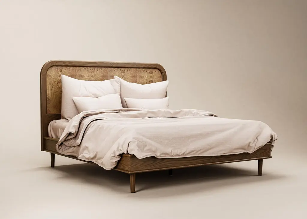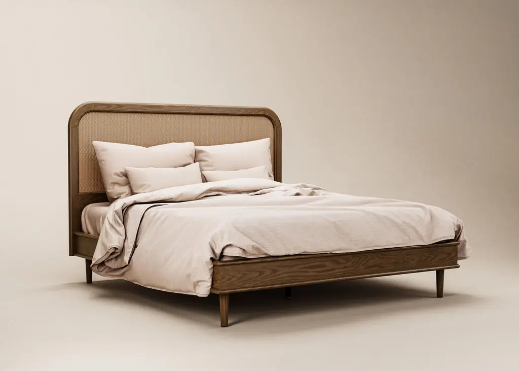A simplified version of the Sanders bed, with a lower headboard, in European oak and rattan. Hand crafted to order in Europe.Available in nine sizes and two timber tones, Natural Oak or Cognac. Hand crafted to order in Europe. Can be produced to bespoke sizes for a surcharge. Please note that each product is handmade and unique, so the colour may differ slightly from the one pictured.Dimensions:Euro Mega King Headboard — 2146W x 62D x 1360HBase — 2122L x 2088W x 380HMattress — 2000L x 2000WOther sizes also available: Euro Double Headboard — 1546W x 62D x 1360HBase — 2122L x 1488W x 380HMattress — 2000L x 1400WEuro KingHeadboard — 1746W x 62D x 1360HBase — 2122L x 1688W x 380HMattress — 2000L x 1600WEuro Super KingHeadboard — 1946W x 62D x 1360HBase — 2122L x 1888W x 380HMattress — 2000L x 1800WUS Queen Headboard — 1656W x 62D x 1360HBase — 2152L x 1608W x 380HMattress — 2030L x 1520WUS King Headboard — 2066W x 62D x 1360HBase — 2152L x 2018W x 380HMattress — 2030L x 1930WUS Californian King Headboard — 1966W x 62D x 1360HBase — 2152L x 1918W x 380HMattress — 2134L x 1829W.——— Can be produced to bespoke sizes for a surcharge. Please note - lead time is maximum. We often hold a small amount of stock which is available much quicker, please enquire. Please note - the headboard is designed to be attached to the wall via split batten for stability.