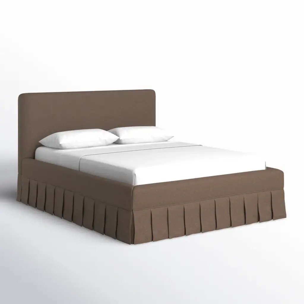 The Milo bed exudes a soft, feminine aesthetic, upholstered in a warm, neutral fabric and featuring a playful yet refined box pleat base reminiscent of vintage finesse, straddling the line between contemporary form and traditional finish. With smoothly rounded corners and graceful, curving forms adding softness to the design, this piece is a study in elegance and subtlety.