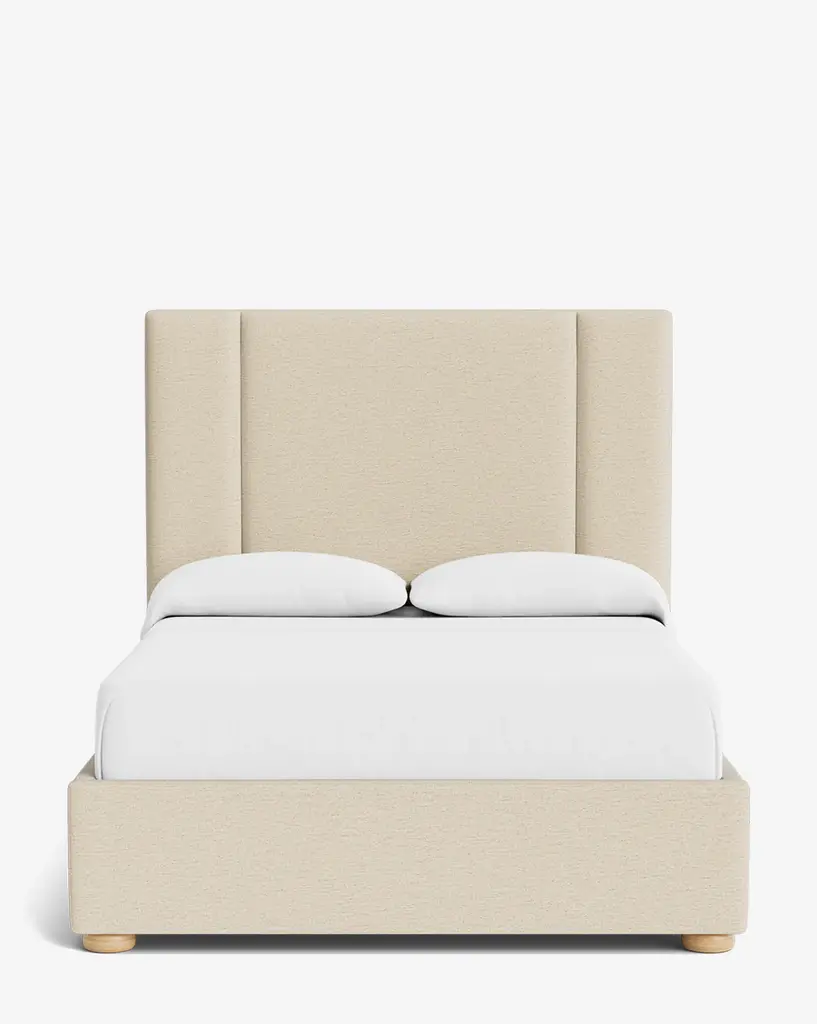 In a bench-made frame upholstered in your selection of high-end fabrics, the Mina Bed is an updated take on classic design. With two streamlined channels that frame pillow vignettes and charming but subtle wood bun feet, the bed frame has a modern yet traditional feel.