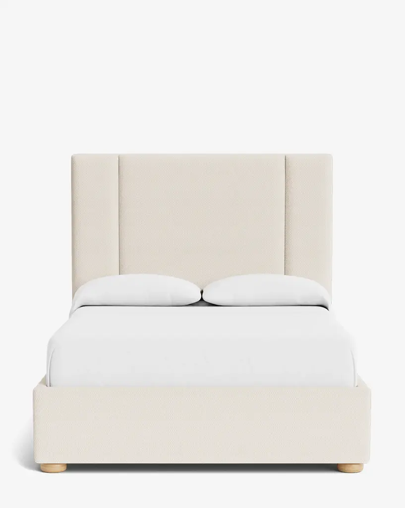 In a bench-made frame upholstered in your selection of high-end fabrics, the Mina Bed is an updated take on classic design. With two streamlined channels that frame pillow vignettes and charming but subtle wood bun feet, the bed frame has a modern yet traditional feel.