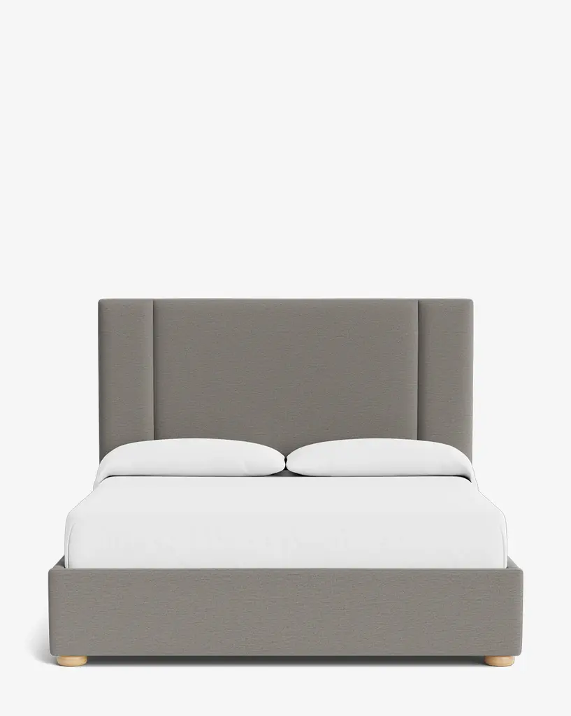 In a bench-made frame upholstered in your selection of high-end fabrics, the Mina Bed is an updated take on classic design. With two streamlined channels that frame pillow vignettes and charming but subtle wood bun feet, the bed frame has a modern yet traditional feel.