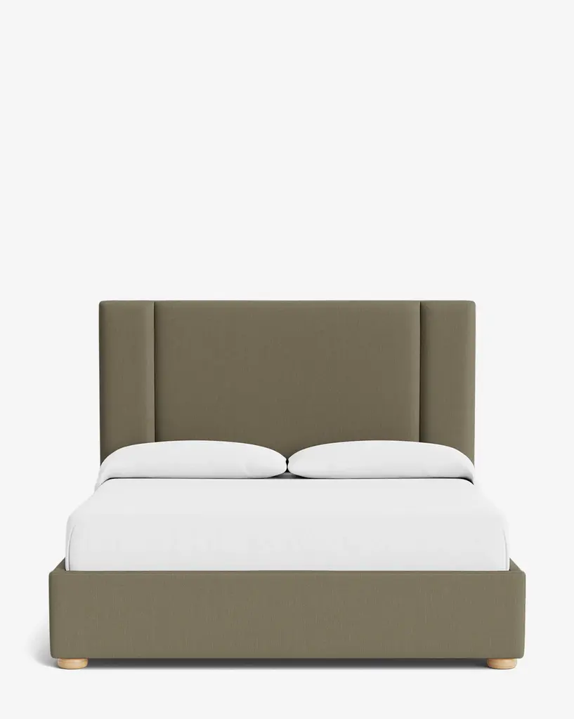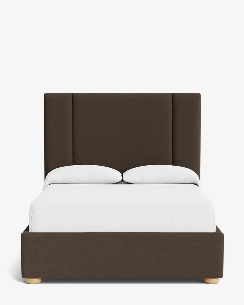 In a bench-made frame upholstered in your selection of high-end fabrics, the Mina Bed is an updated take on classic design. With two streamlined channels that frame pillow vignettes and charming but subtle wood bun feet, the bed frame has a modern yet traditional feel.