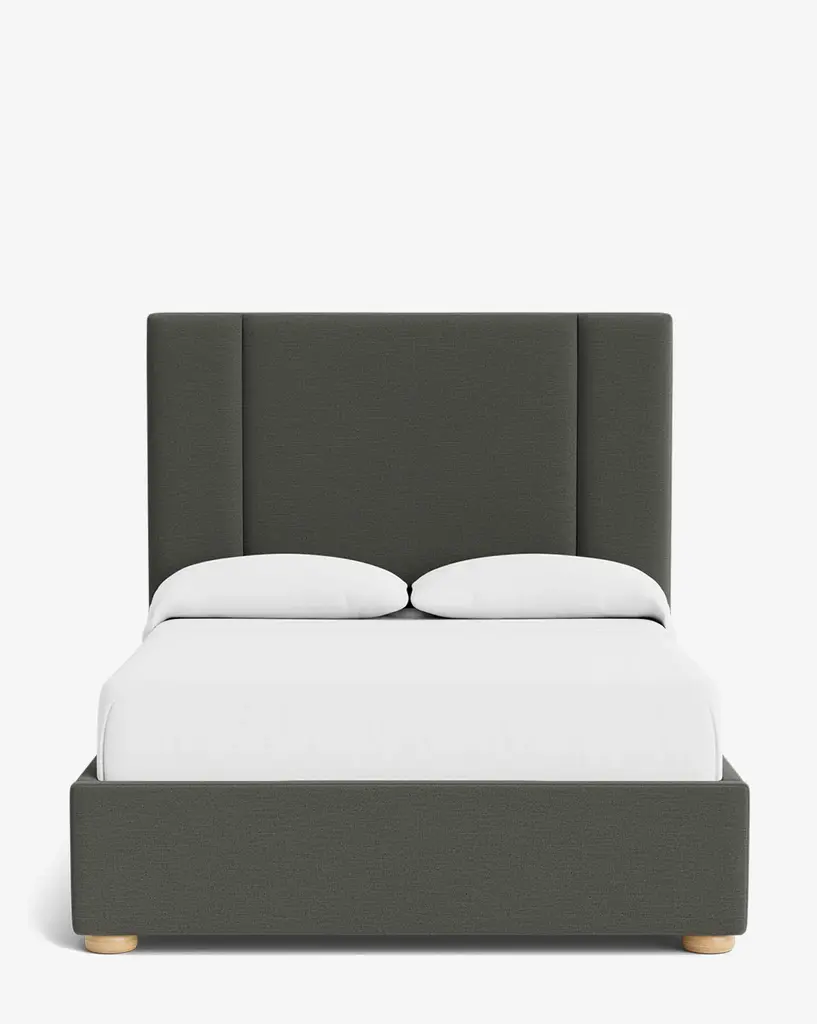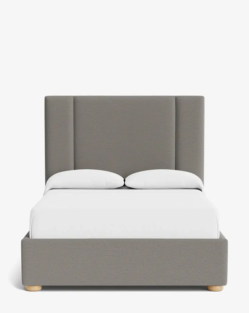 In a bench-made frame upholstered in your selection of high-end fabrics, the Mina Bed is an updated take on classic design. With two streamlined channels that frame pillow vignettes and charming but subtle wood bun feet, the bed frame has a modern yet traditional feel.