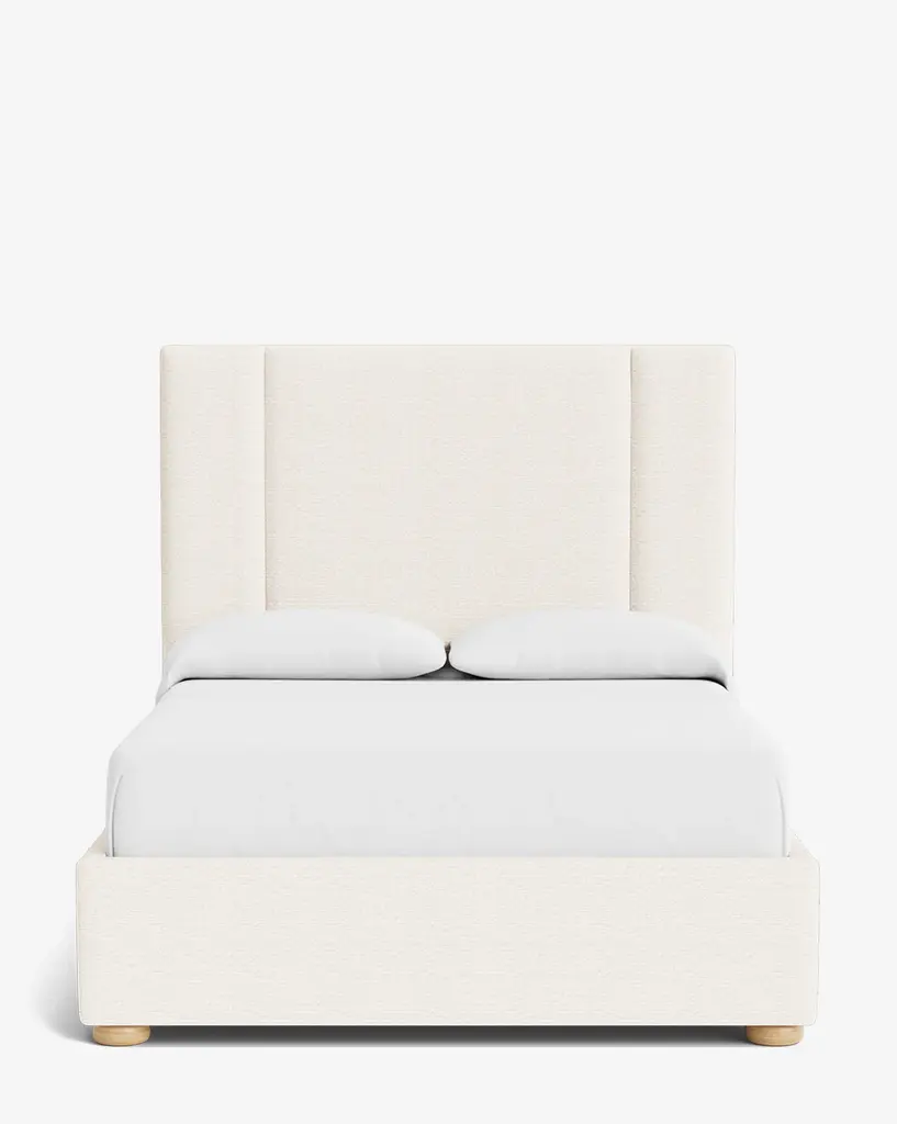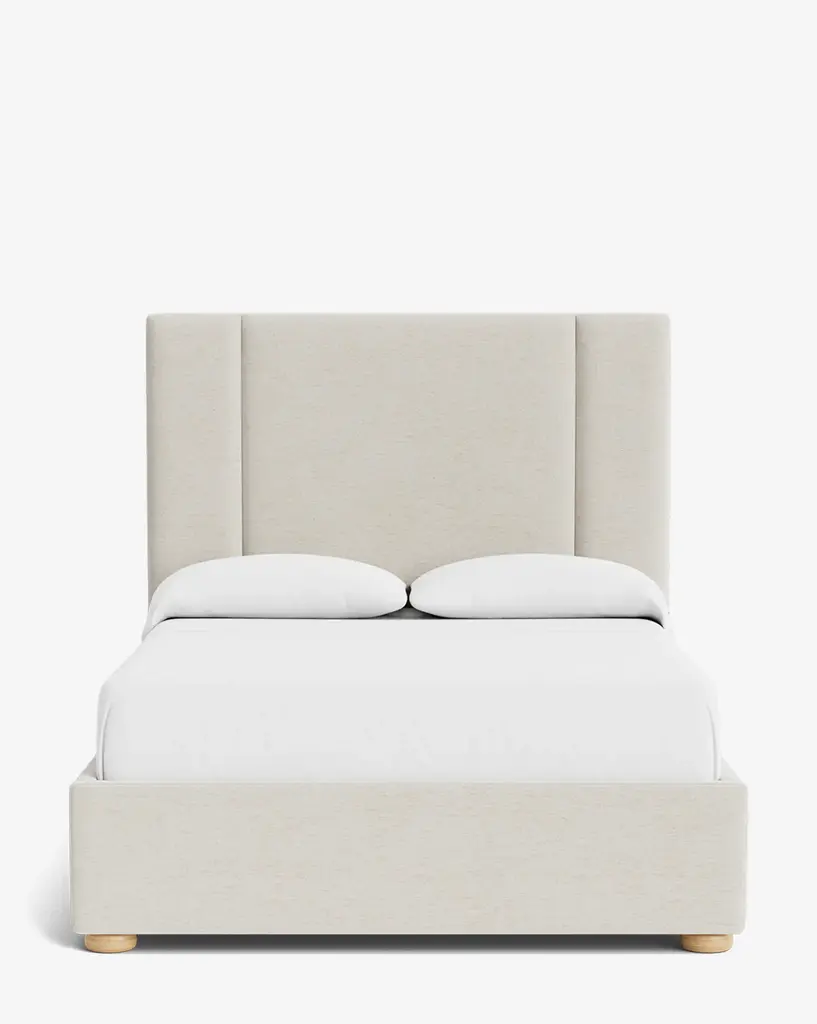 In a bench-made frame upholstered in your selection of high-end fabrics, the Mina Bed is an updated take on classic design. With two streamlined channels that frame pillow vignettes and charming but subtle wood bun feet, the bed frame has a modern yet traditional feel.