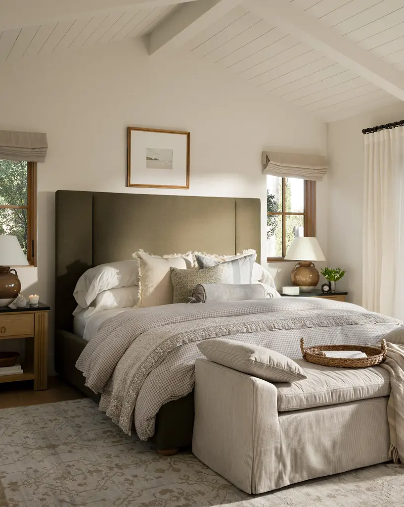 In a bench-made frame upholstered in your selection of high-end fabrics, the Mina Bed is an updated take on classic design. With two streamlined channels that frame pillow vignettes and charming but subtle wood bun feet, the bed frame has a modern yet traditional feel.