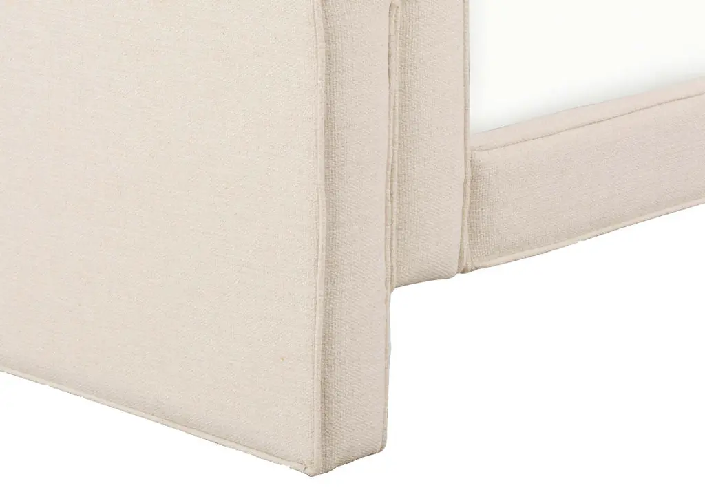 Sculptural and eye-catching, the Mitchell Bed lends a curved design complemented by versatile cream upholstery. Pair with pillows and blankets for an inviting, tasteful style.
