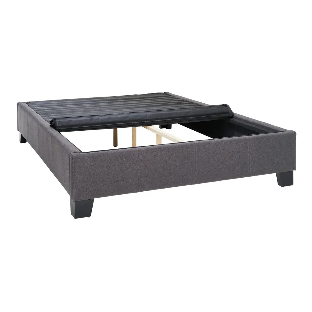 The Modern bed frame takes the place of both a metal frame and a box spring/foundation. Handsomely styled, it's fully upholstered, so no need to cover it up with a bed skirt—and no hard edges to worry about. Quick and easy to assemble, this durable foundation has drop-in rails, a Velcro-attached slat roll, and a clip-in center support with legs.