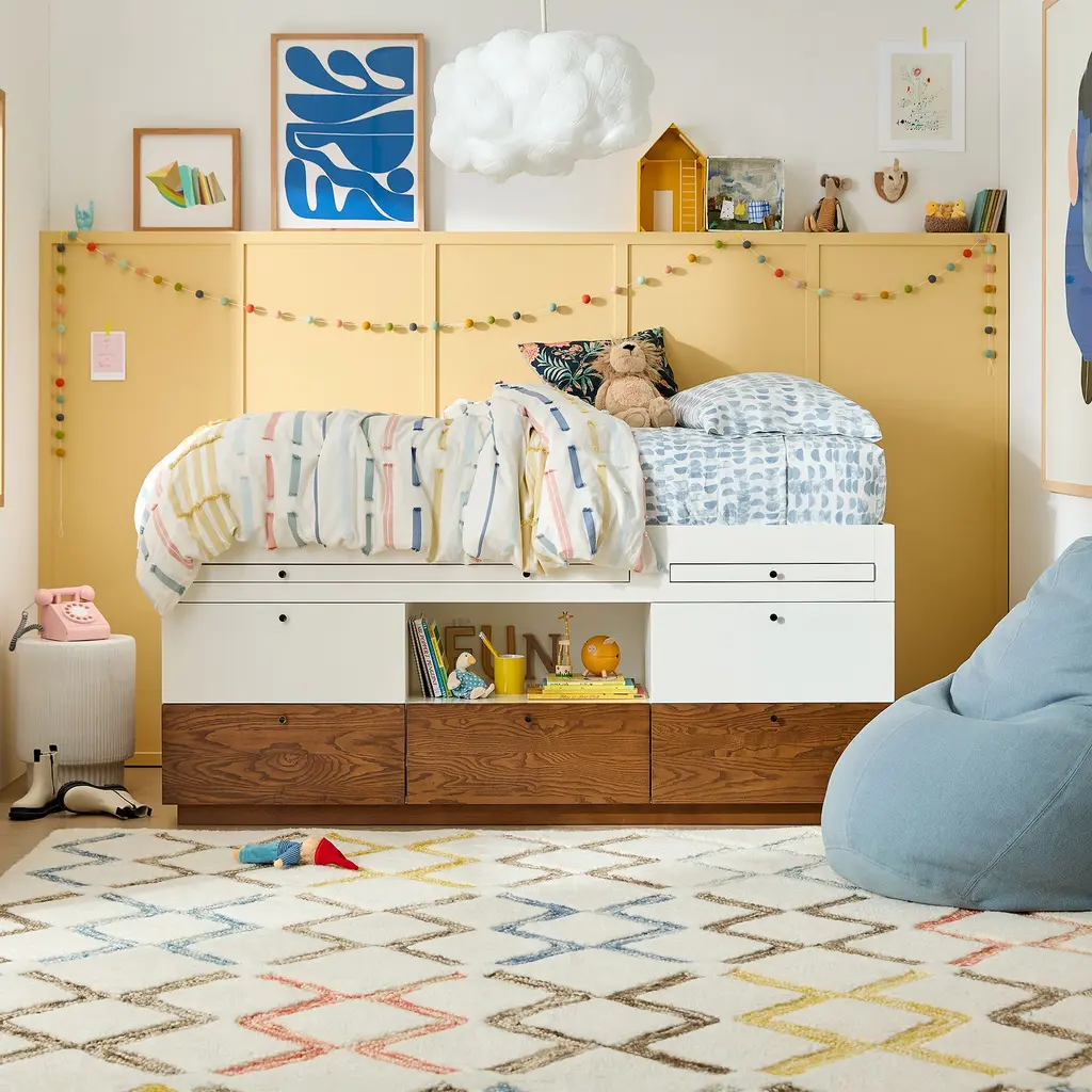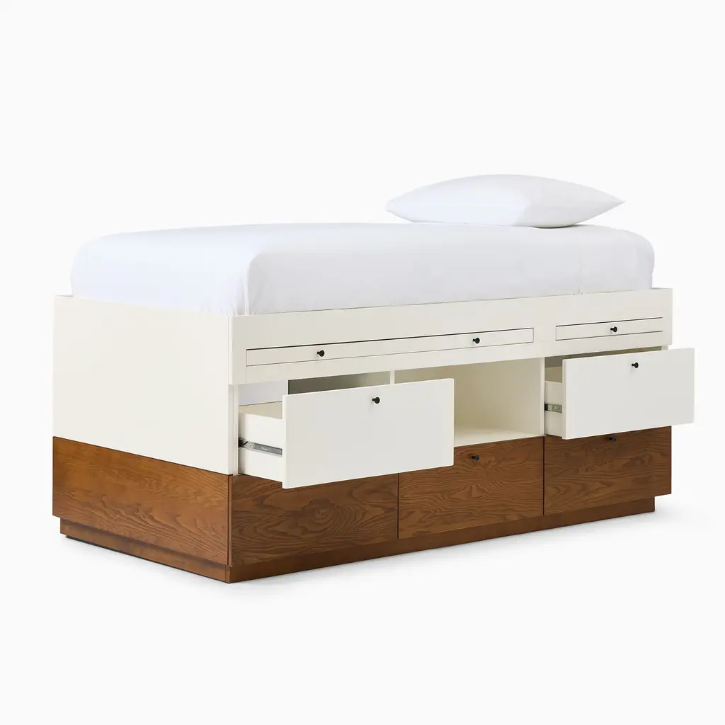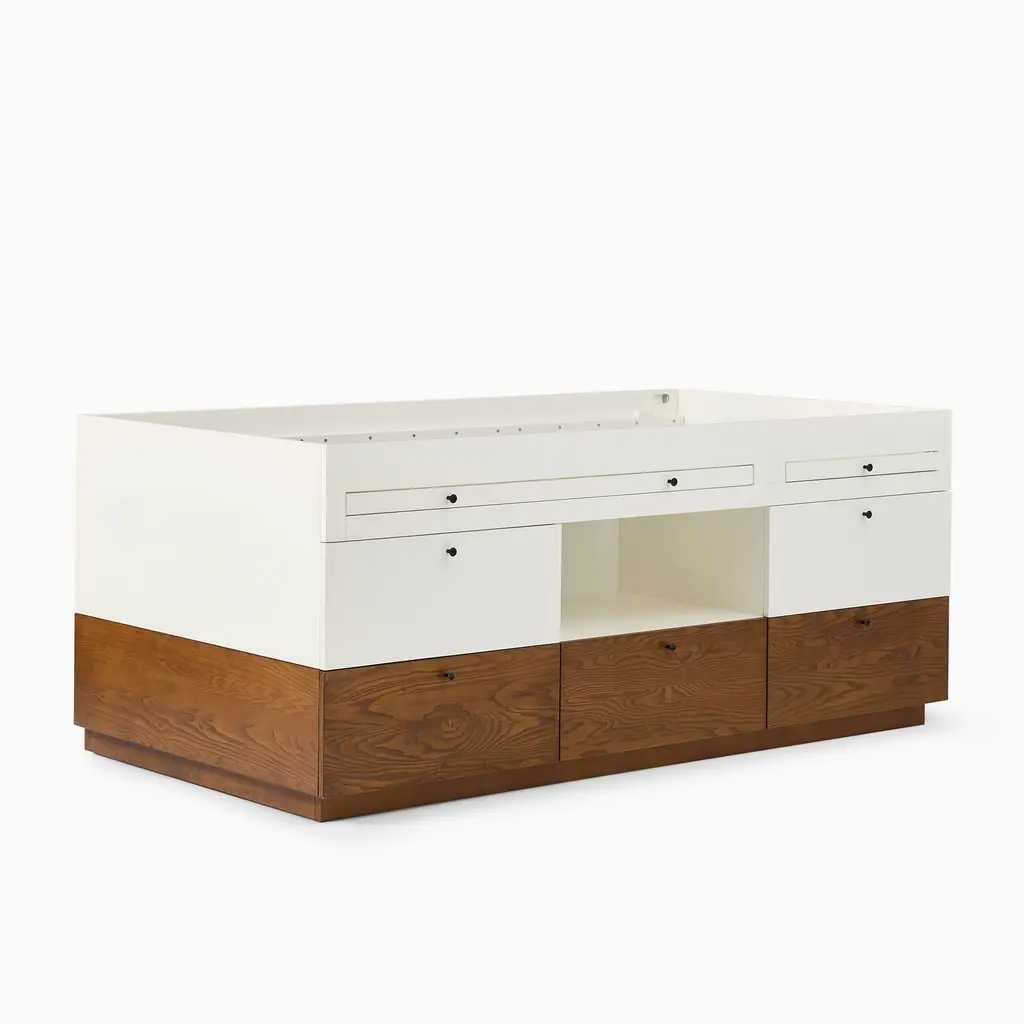 This versatile bed is a space maximizer. It has a mix of open & closed storage, plus a desk. Durably made & covered in child-safe finishes. GREENGUARD Gold Certified as low VOC.