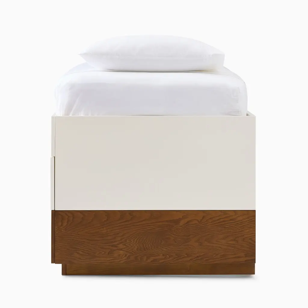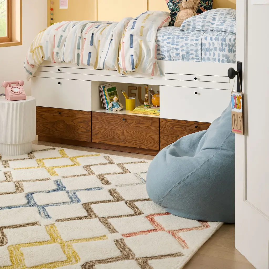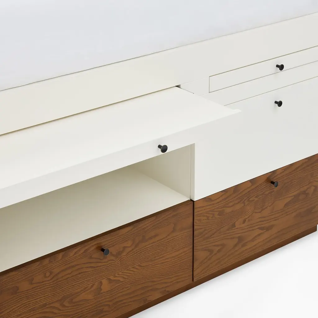 This versatile bed is a space maximizer. It has a mix of open & closed storage, plus a desk. Durably made & covered in child-safe finishes. GREENGUARD Gold Certified as low VOC.