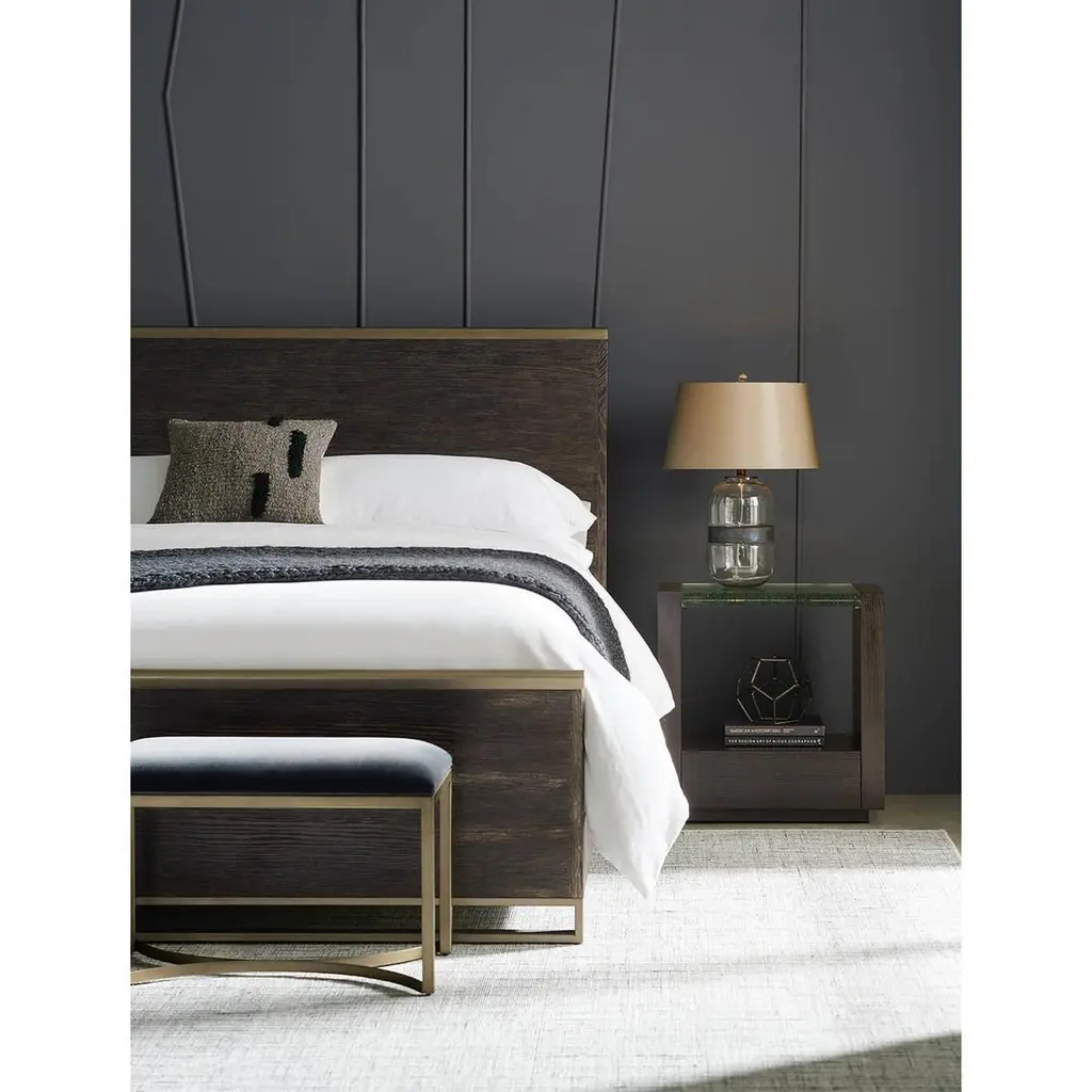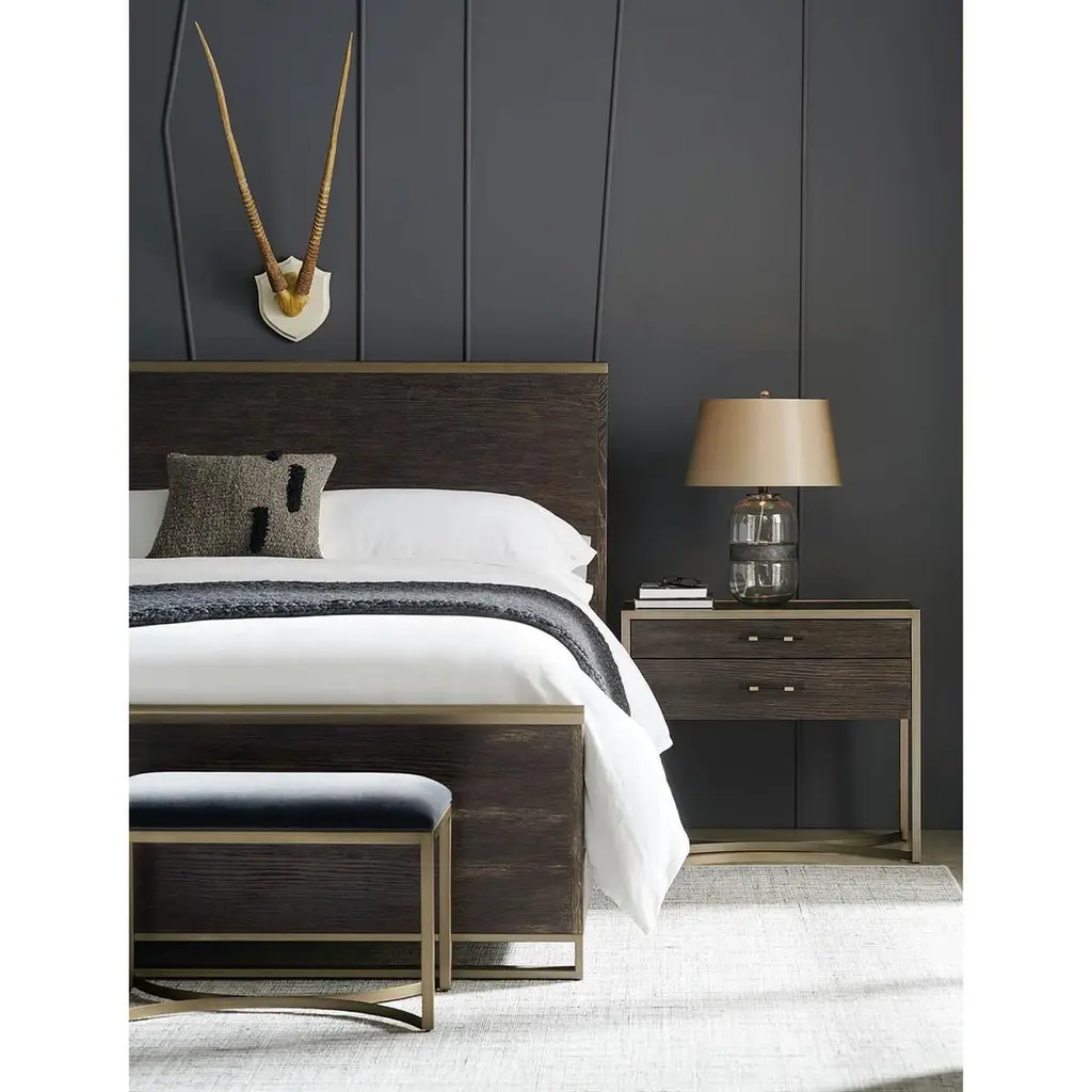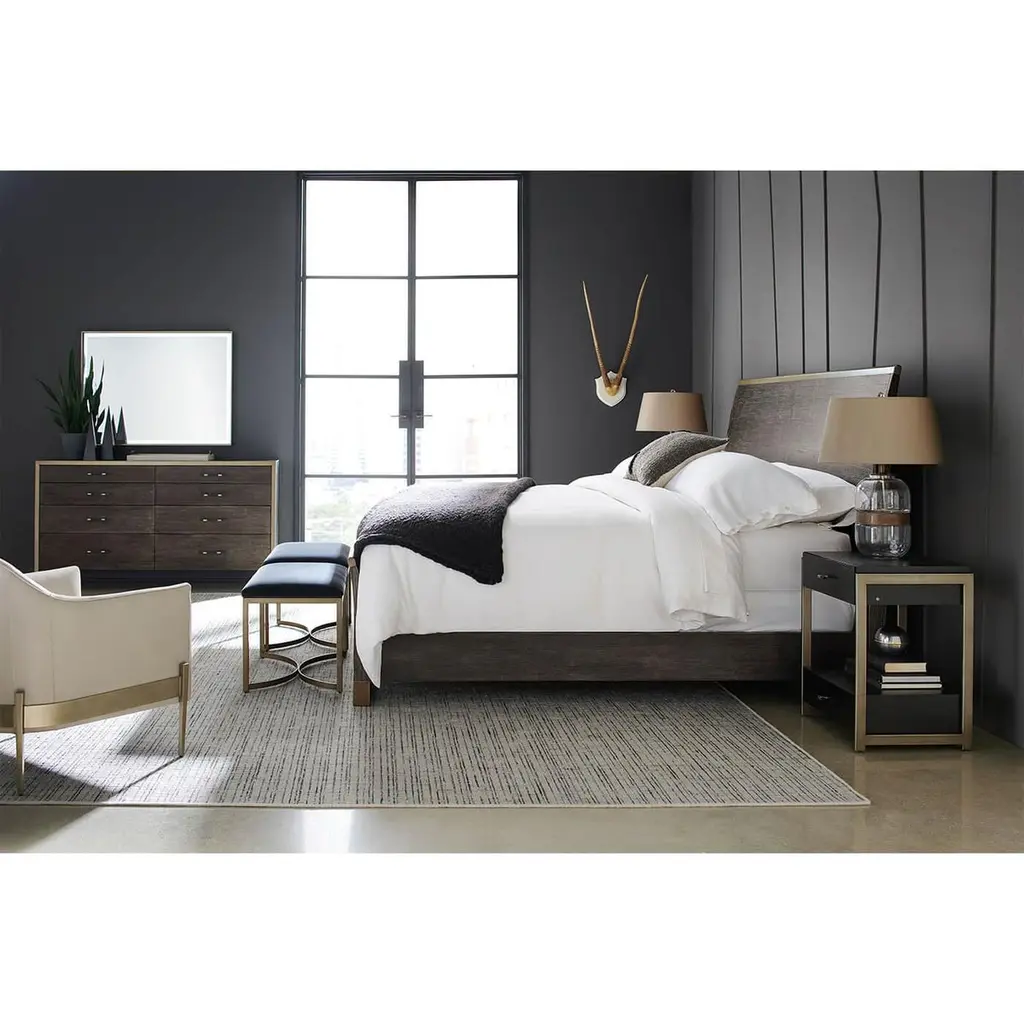 A modern cerused oak king bed with a metal rail in bronze metallic paint outlining the top of both the headboard and footboard. The headboard and footboard have a slightly curved profile. Dimensions80" W x 91" D x 56" H