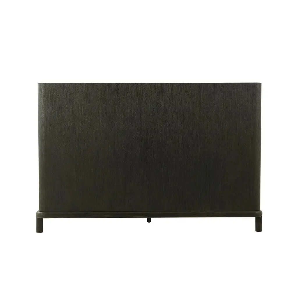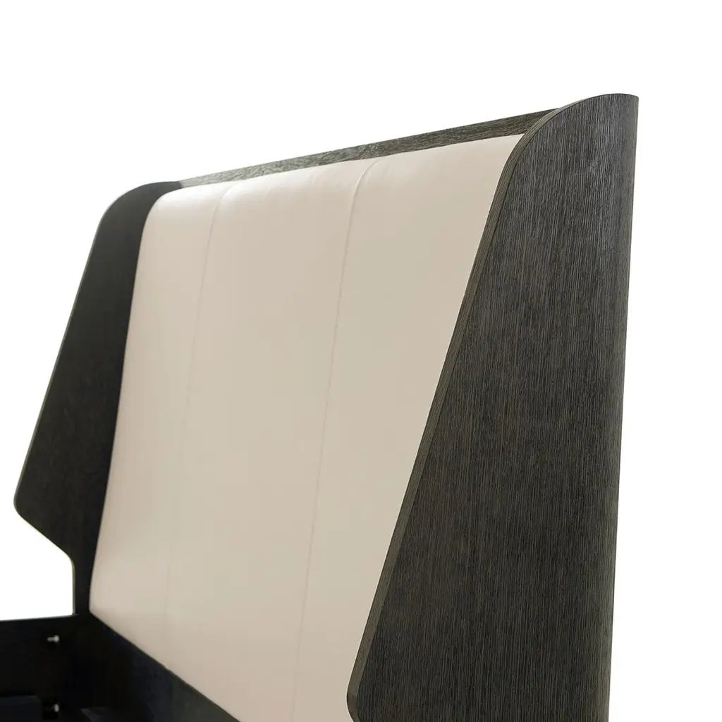 Beautifully raised on round Mission-style legs. The leather upholstered wing bnack headboard is fully veneered on the back as are the rails and footboard. Dimensions: 82.75" W x 91.5" D x 54.25" HShown in Charcoal Oak FinishShown in Twild-LE0295 LeatherFor US King mattress - 76 x 80" Side and Front Rail Apron Clearance: 5½ in