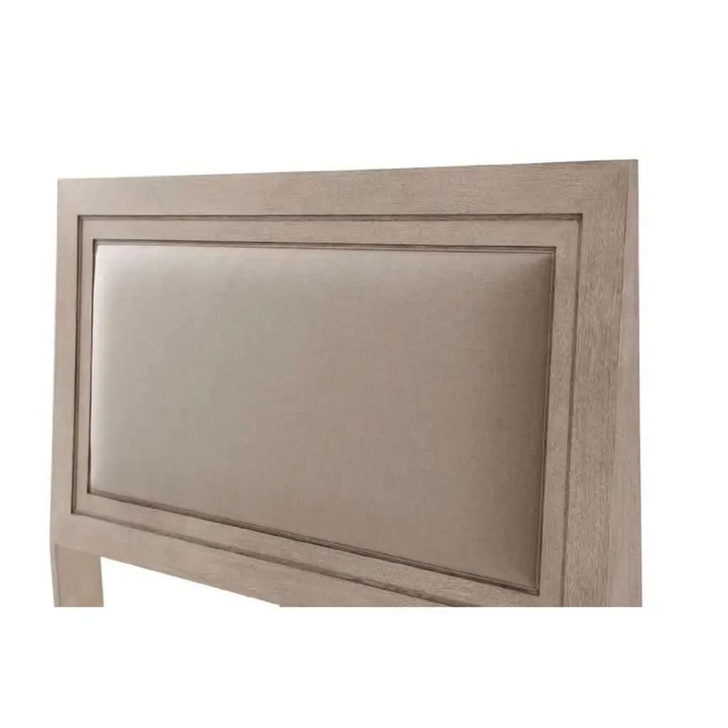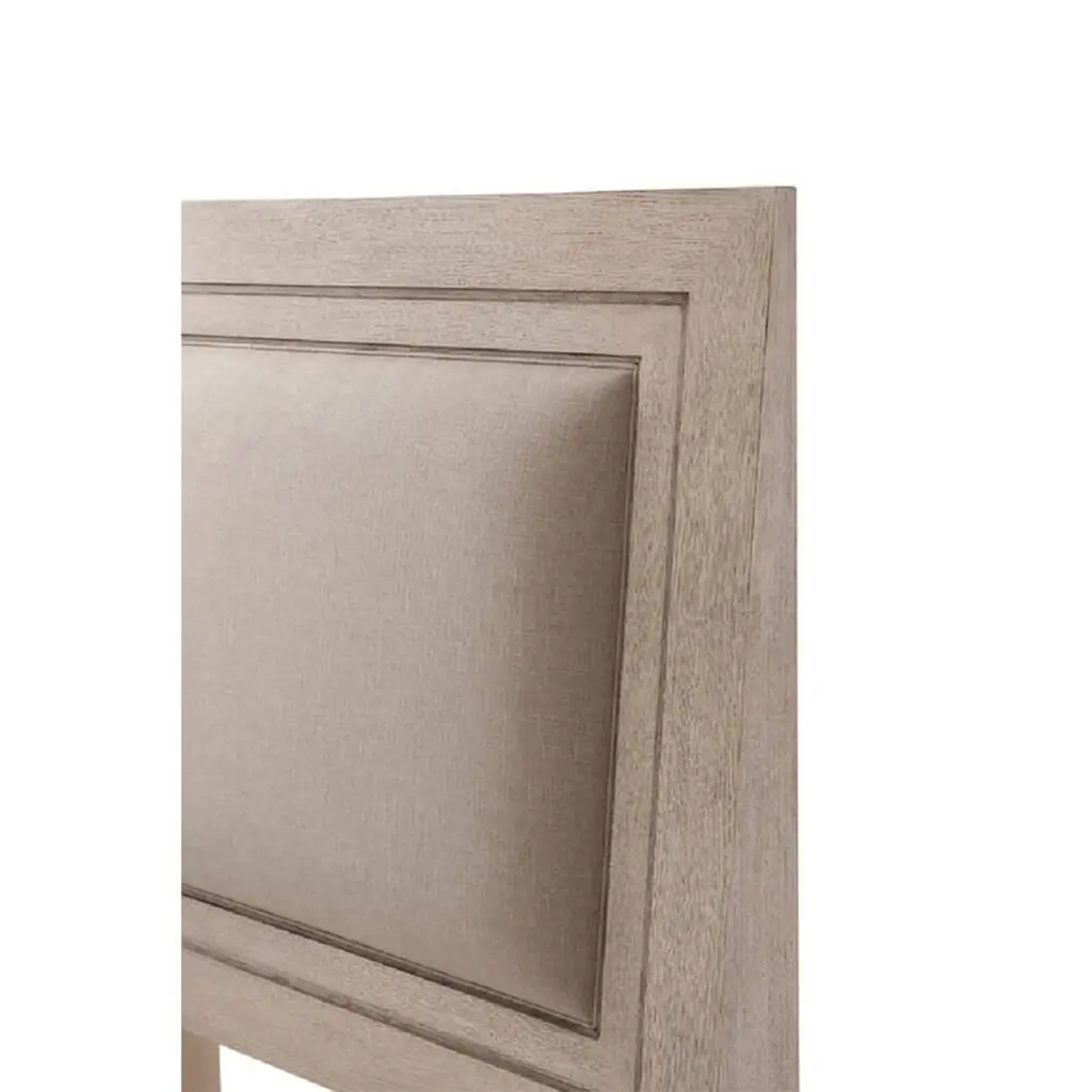 Modern oak quarter veneered king size bed with an angled pictured framed headboard with an upholstered panel back and a geometric figured paneled footboard.Dimensions: 80.5" W x 89.75" D x 66" HFor US King mattress - 76 x 80".