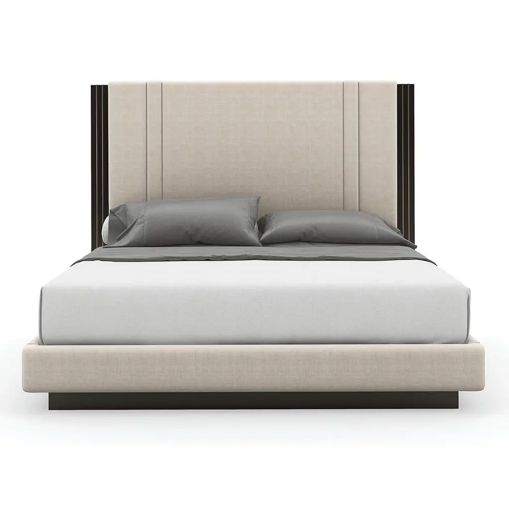 This bed features a dashing, modern aesthetic with a distinctive upholstered headboard, footboard, and side rails in a light-toned performance fabric that offers both durability and style.The dramatic headboard stands out with its Dark Chocolate trim, which beautifully frames the bed and adds a rich visual contrast. The stunning detail of a metal inlay in Champagne Gold weaves a touch of warmth and sophisticated allure into the design, elevating the overall aesthetic of your bedroom.Resting on a Dark Chocolate plinth base, the bed's solid and grounded design not only provides robust support but also complements the sleek, clean lines of the Parsons style. This bed is a statement piece that marries the timeless appeal of classic design with contemporary touches to create a serene and inviting bedroom environment.Dimensions: 83.25" W x 87.75" D x 60" H