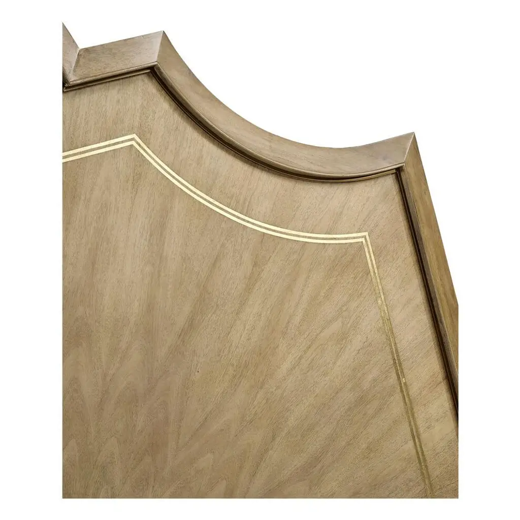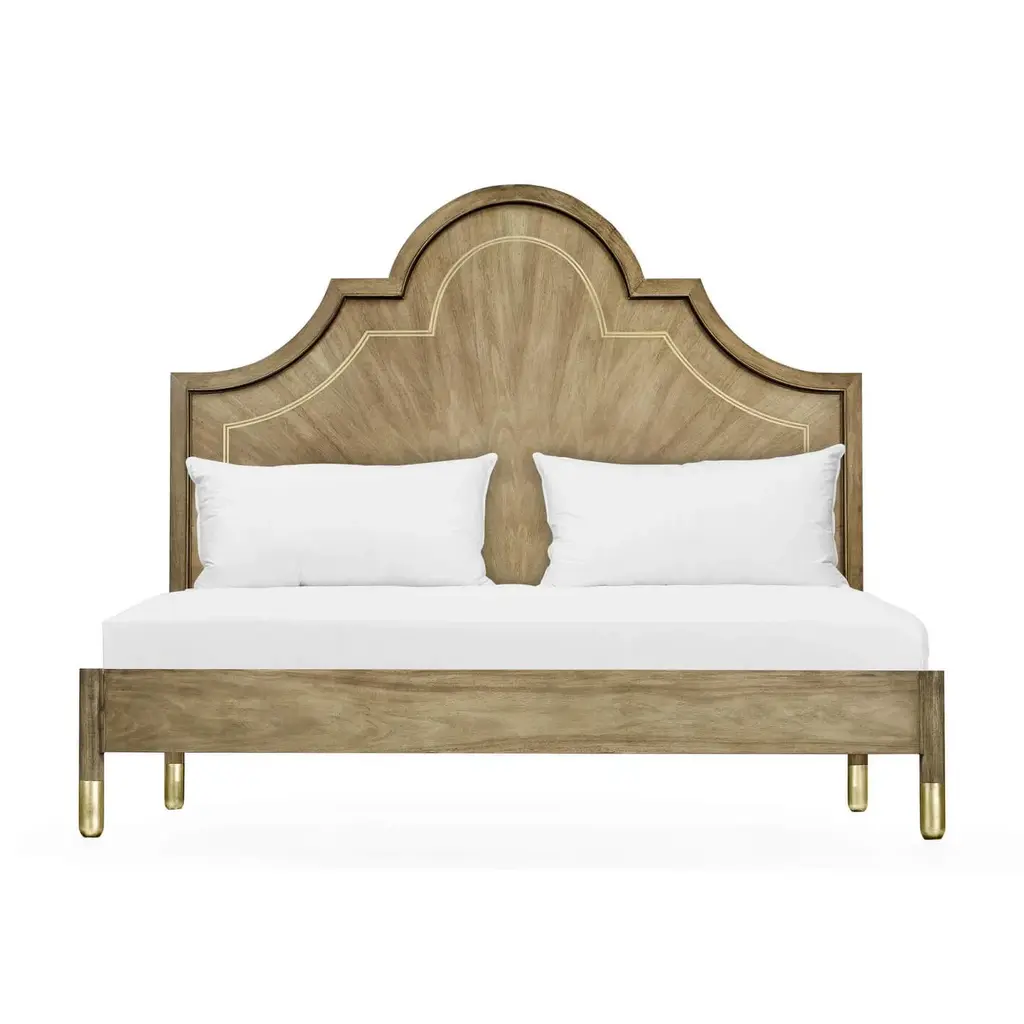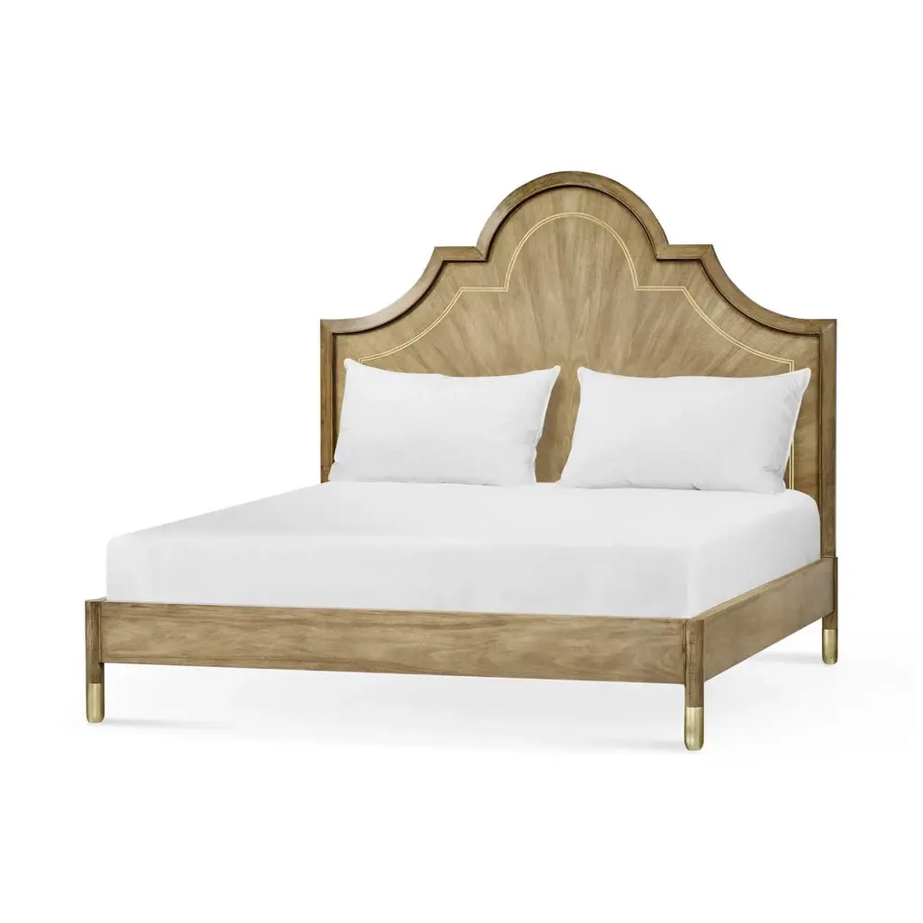 A Modern walnut and brass inlaid king size bed. The arched headboard with bleached figured walnut inlaid with brass trim and raised on a walnut frame with turned legs and brass feet. Dimensions: 81.5" W x 85.5" D x 68.88" H
