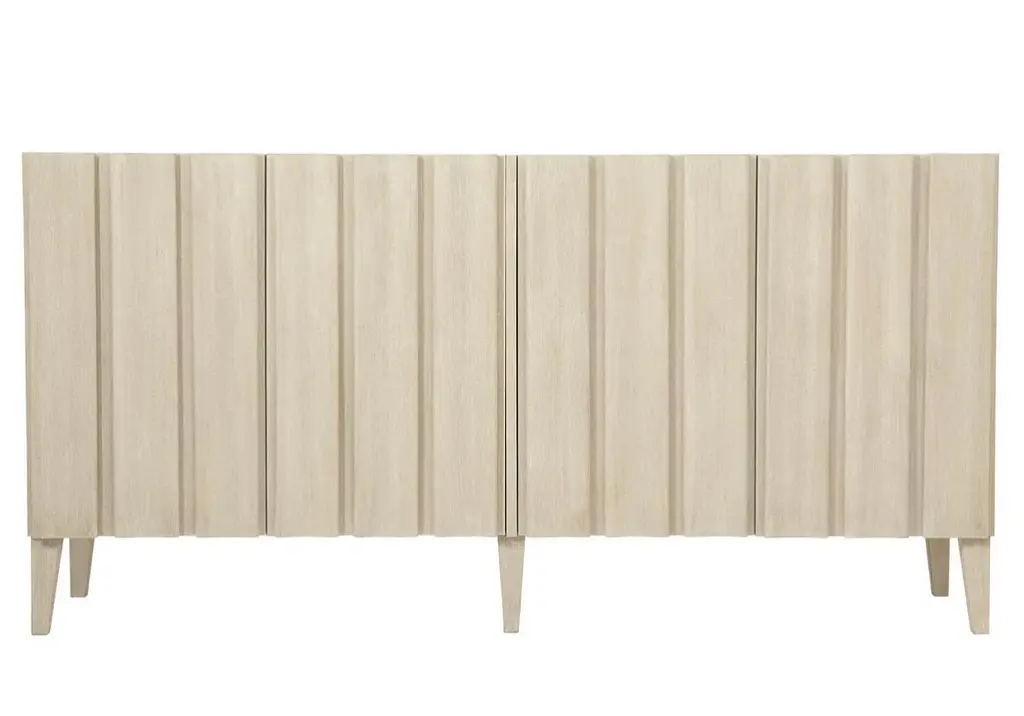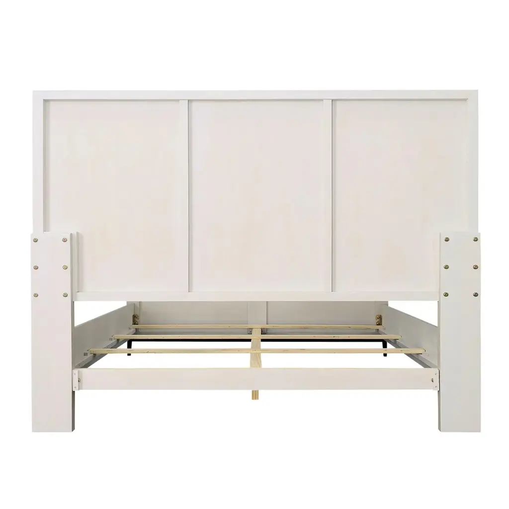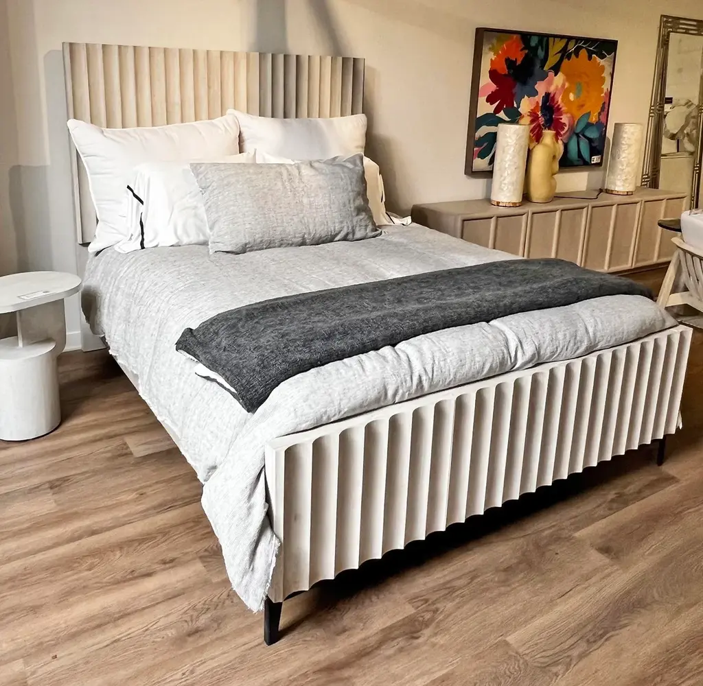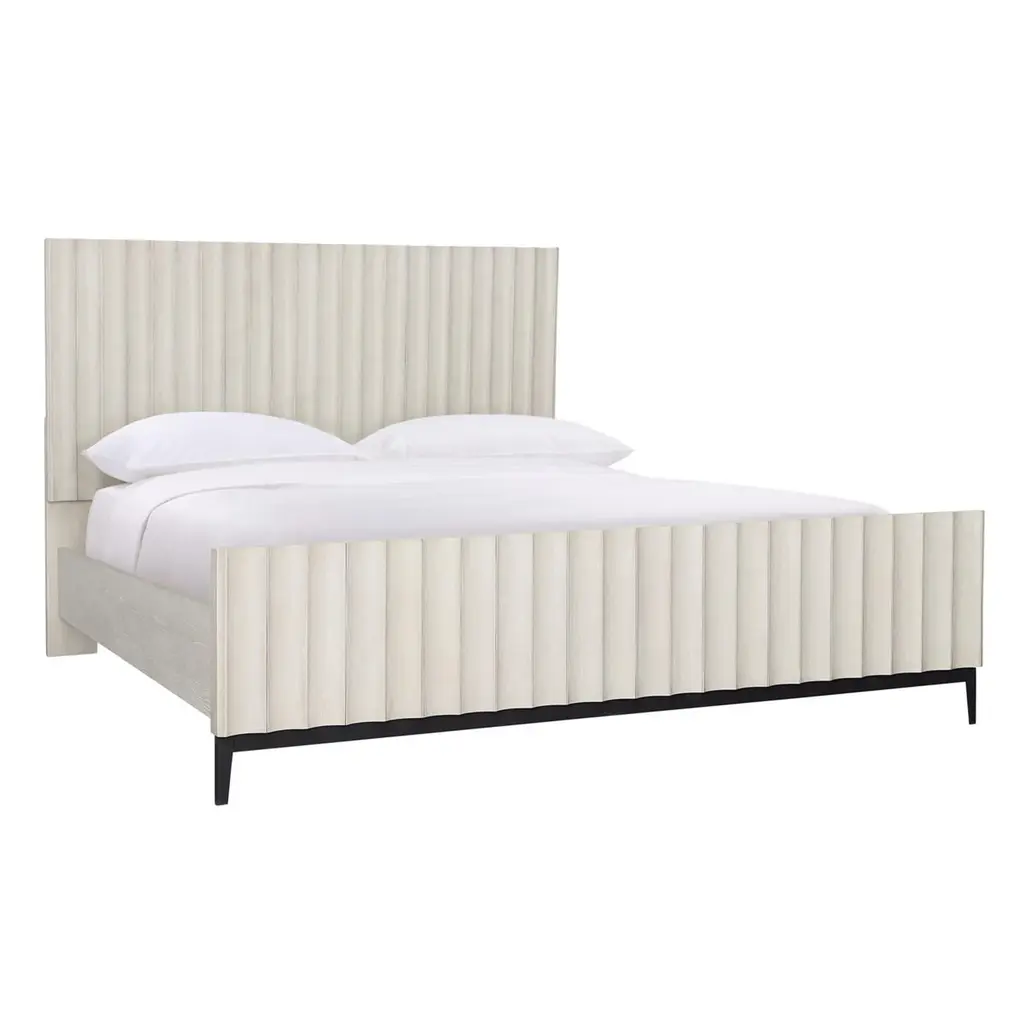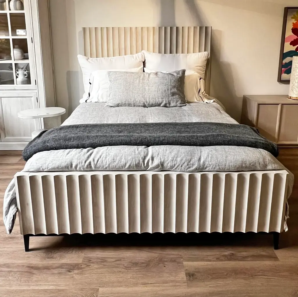Modern white wash oak wood bed frame in eastern king size. Carved concave stripe deign on headboard and footboard with black iron feet. Each may have slight variations in exact tones/finish and wood grain. This bed weighs approx. 185 lbs.