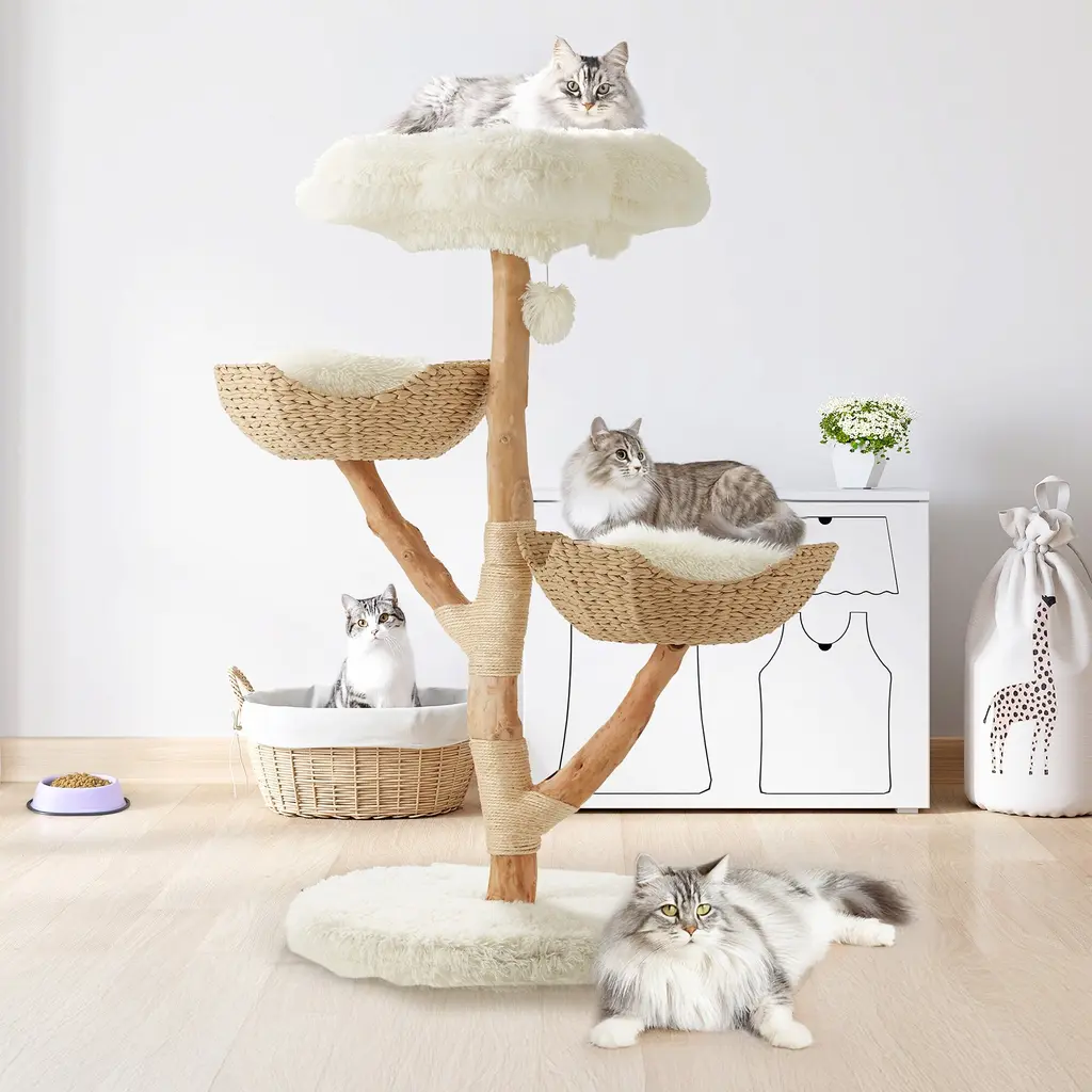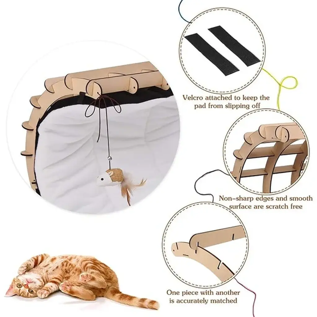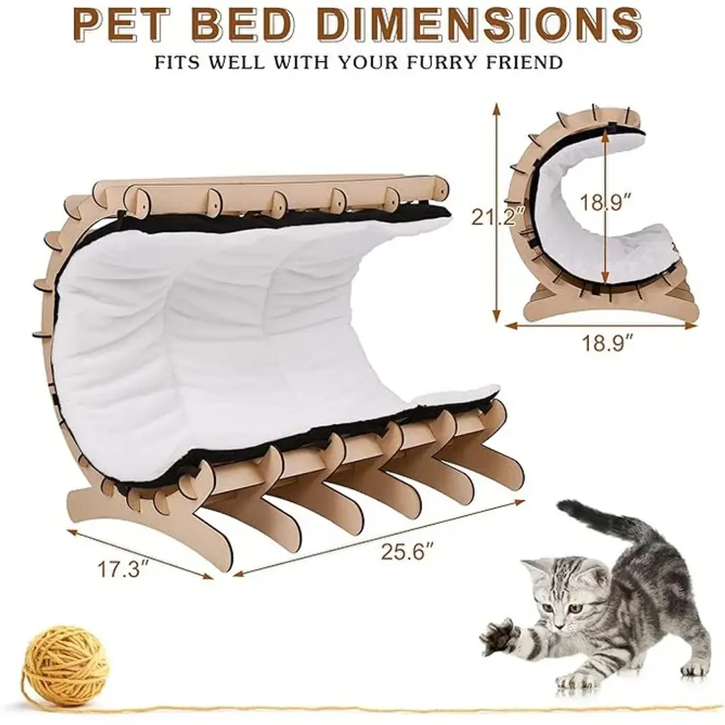 Description:The Modern Wood Cat Lounge Bed Hammock offers a stable, safe, and stylish space for your cat to relax, play, and lounge. Crafted with precision, this cat bed features a sturdy wooden frame and a soft, washable pad secured with Velcro. Non-sharp edges ensure your pet's safety, while two hanging toys—a mouse and a ball with a bell—provide interactive fun.Designed to complement your home decor, this cat bed is a perfect blend of functionality and elegance. Ideal for medium and small animals, it can hold up to 20 lbs, making it a great addition to your pet's collection.Key Features:Enhance your cat's lounging experience with the Modern Wood Cat Lounge Bed Hammock, combining safety, comfort, and style.