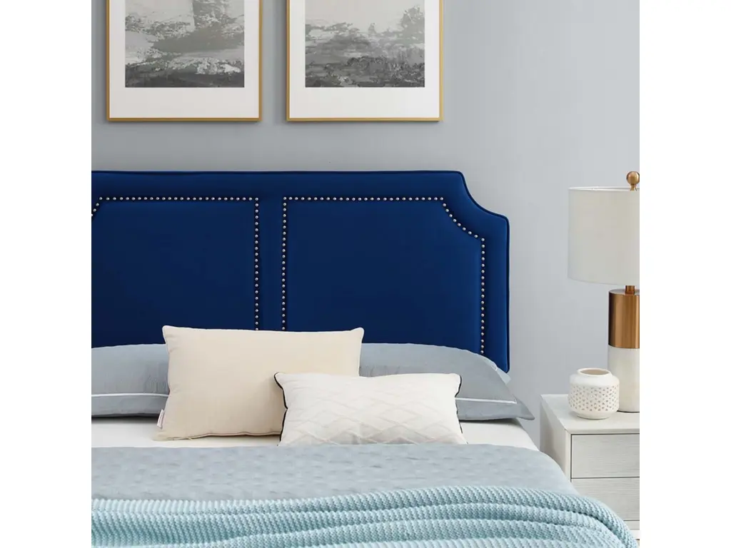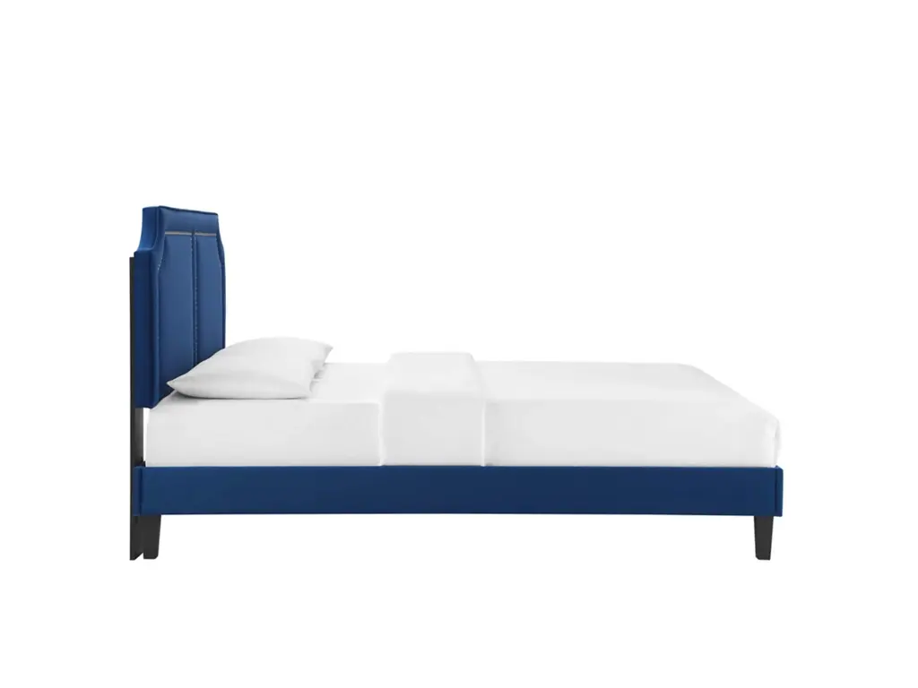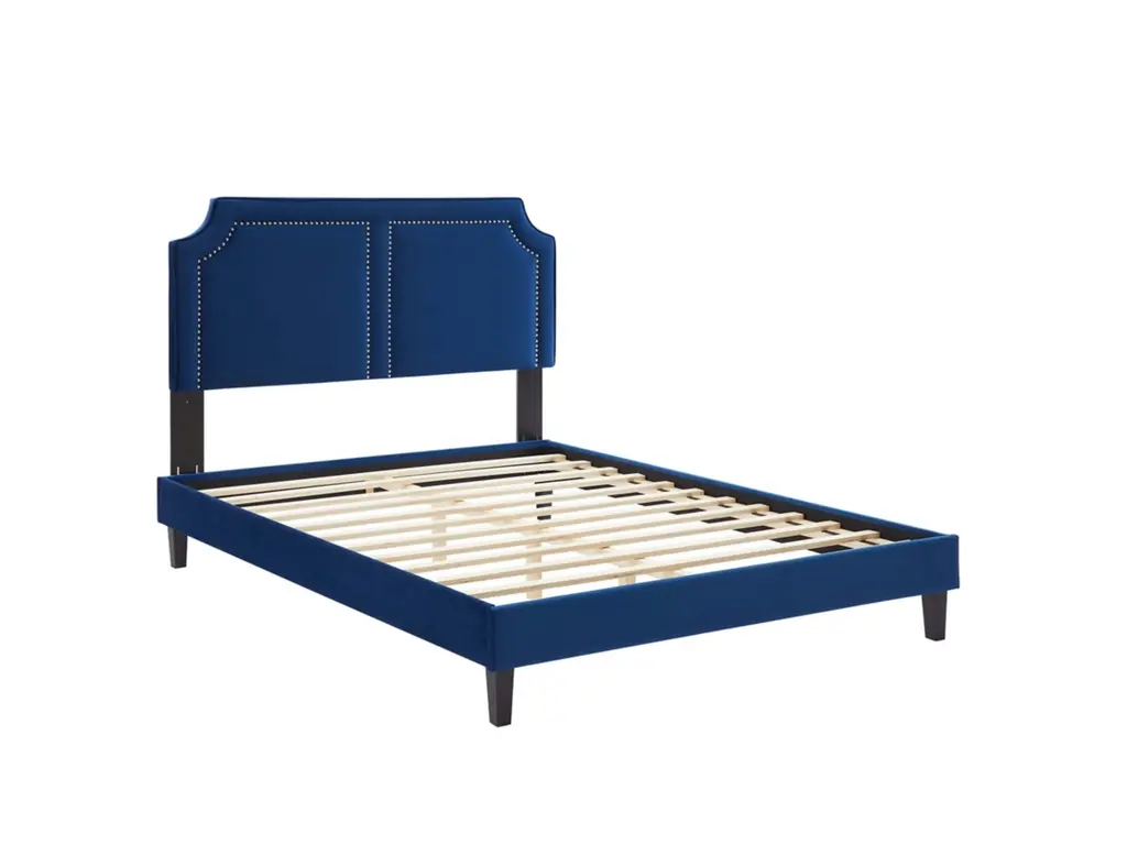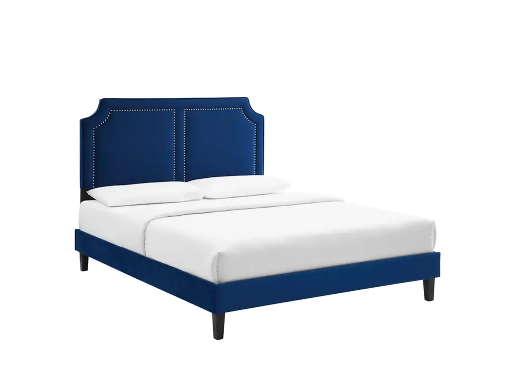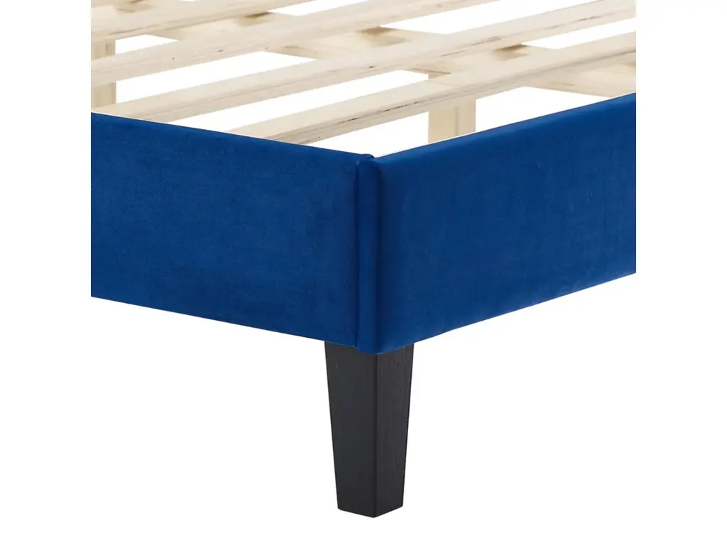 Cultivate an inspiring and upscale aesthetic in your master bedroom or guest room with the refined Novi Performance Velvet King Bed. The upholstered headboard is built with a solid plywood frame, artfully notched corner and precise nailhead trim. Its soft, modern silhouette adds glam deco style to mid-century modern or eclectic decors. This king-sized platform bed is tailored in stain-resistant performance velvet, and its well-crafted MDF frame grants an enduring foundation for memory foam, innerspring, latex, and hybrid mattresses. A durable poplar wood slat support system ensures strength and steady support, eliminating the need for a box spring. The slatted bed frame has a reinforced center beam with two support legs for enhanced stability. Novi stands on tapered black wood legs with non-marking foot caps. Assembly required; weight capacity 800 lbs.