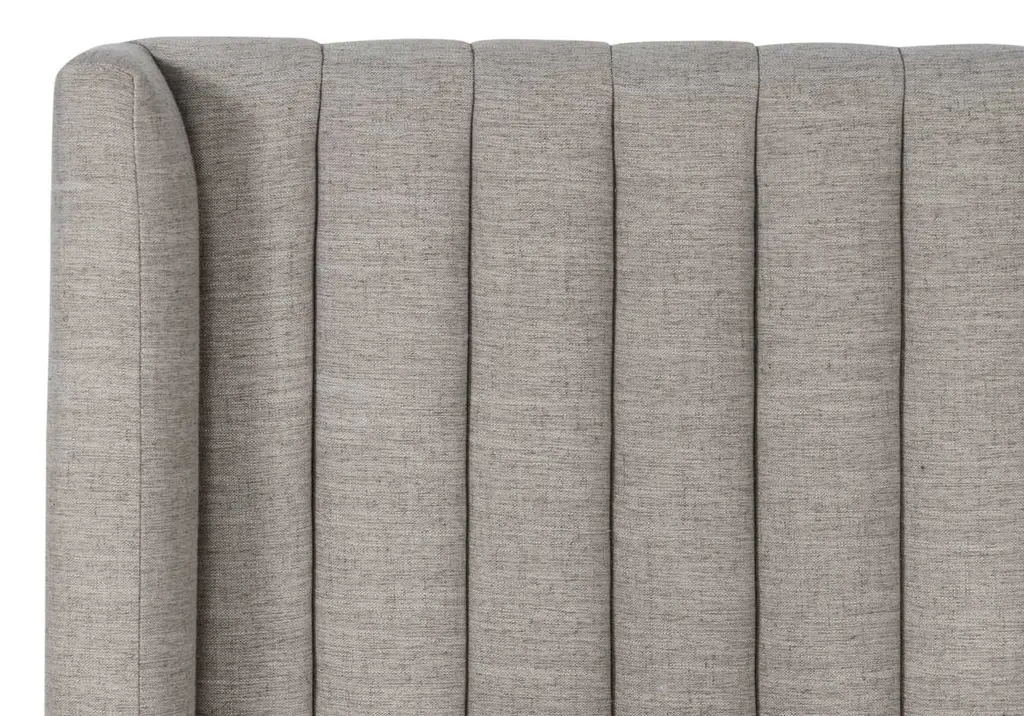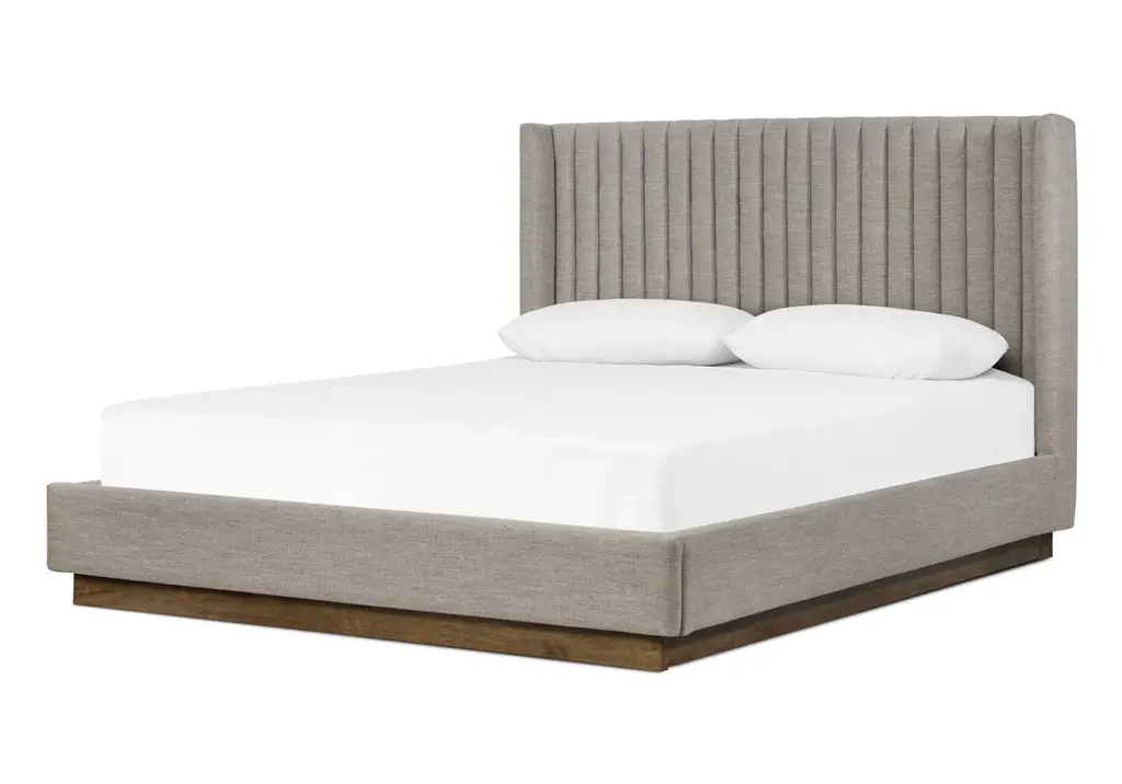 The Montgomery makes a significant impression with its tall, slightly winged headboard complemented by a straightforward form. Clean, verticle running channels add dimension, accentuating its modern look. Upholstered in a gray performance fabric and set on a natural wood plinth base with supporting slats, it easily styles into a variety of bedrooms lending a tasteful, refined look.