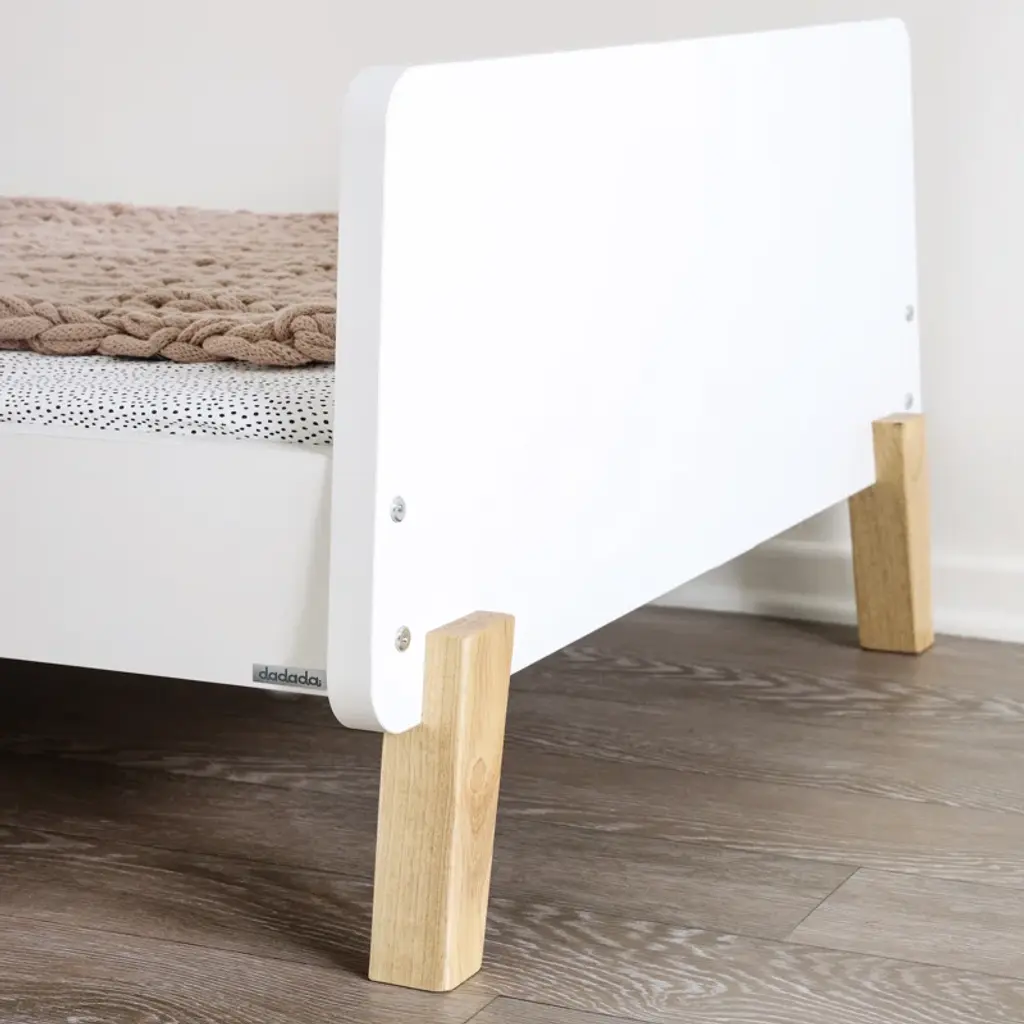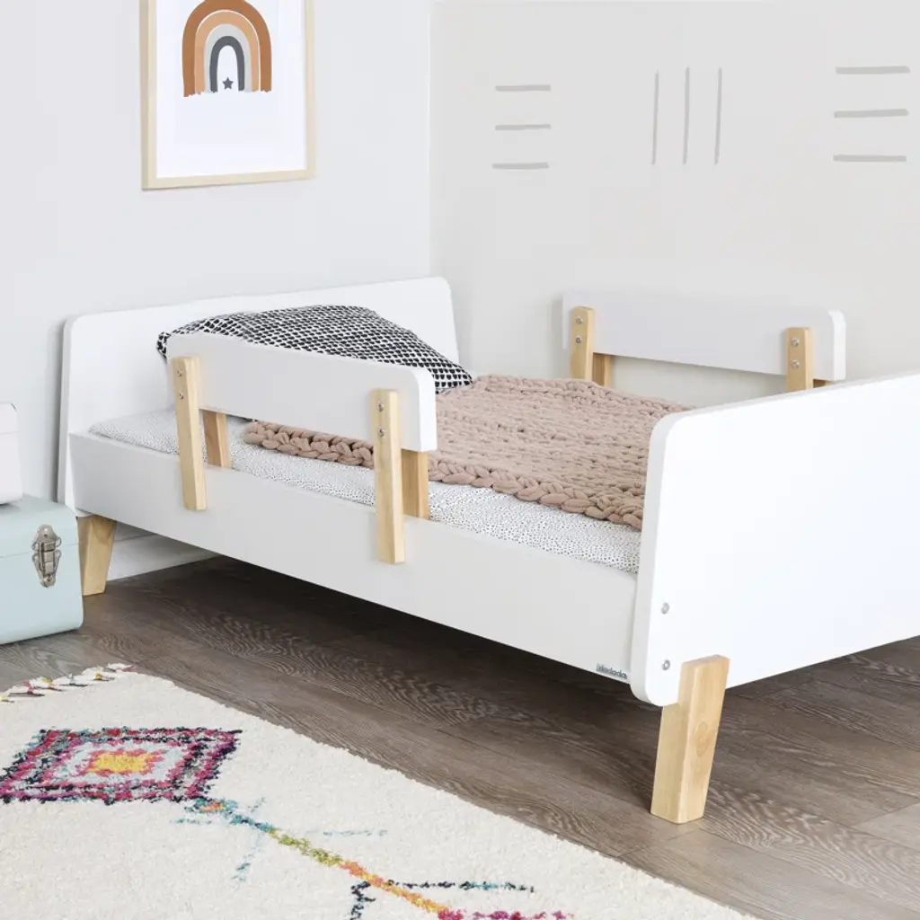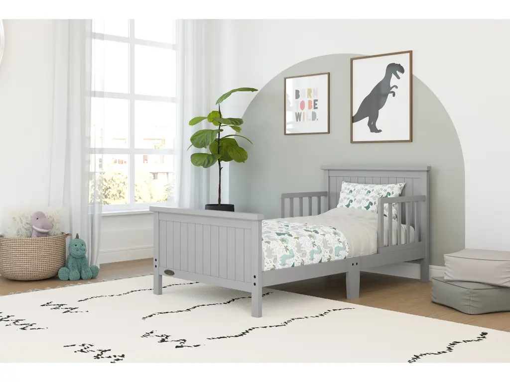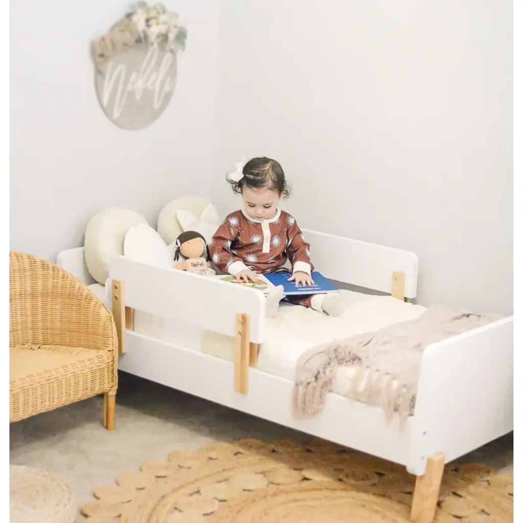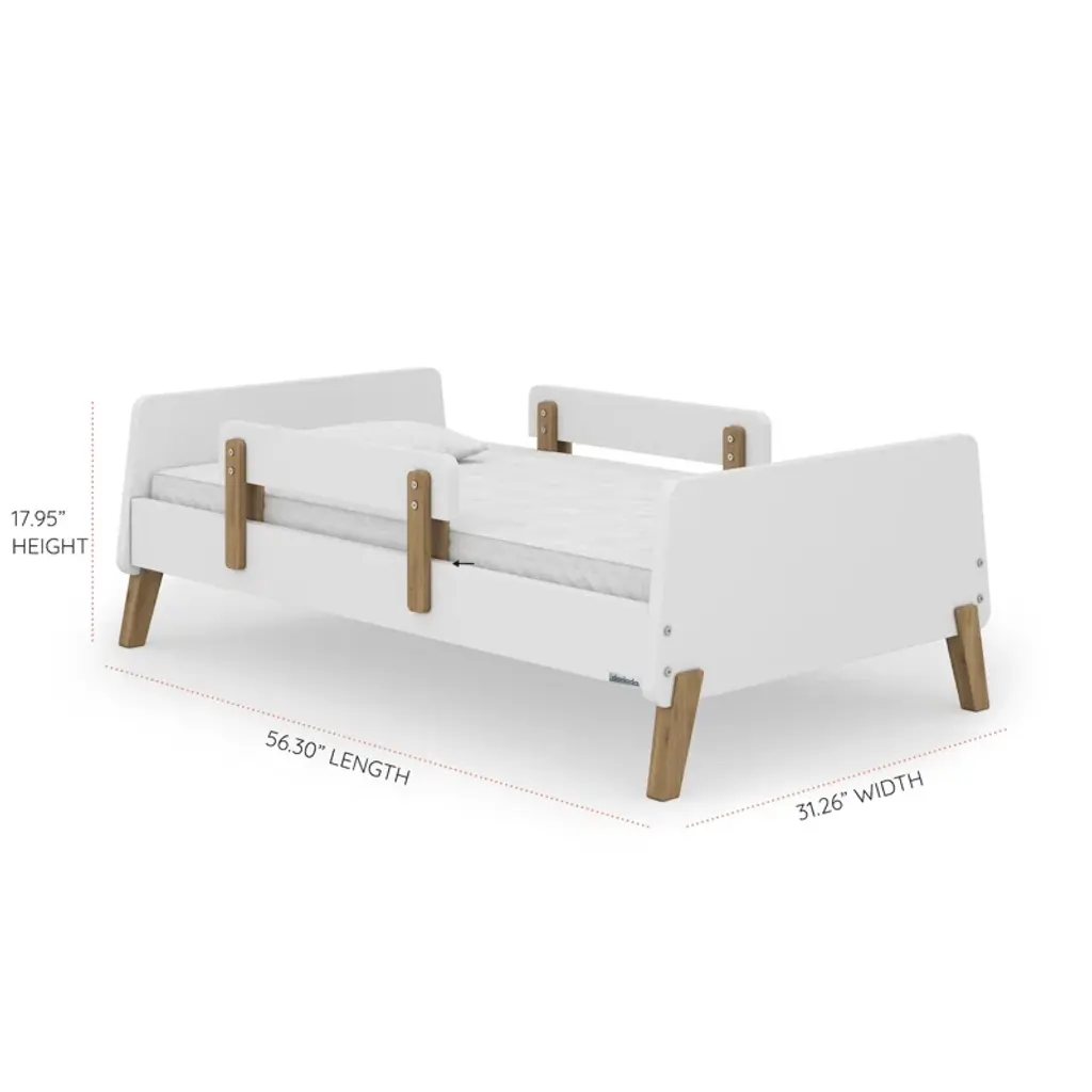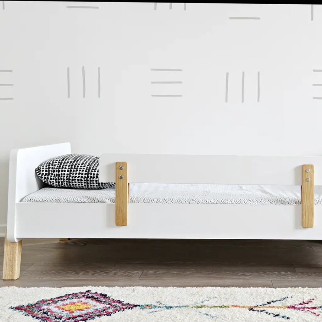 "A sturdy bed built just for toddlers with playful curves and modern shapes to smooth the meaningful transition into “a real bed.” The low profile and two removable rails provide a safe and comfortable sleeping place that helps your active toddler easily get in and out of bed. This high-quality bed fits a standard crib mattress and brightens any decor with a pop of modern design. "