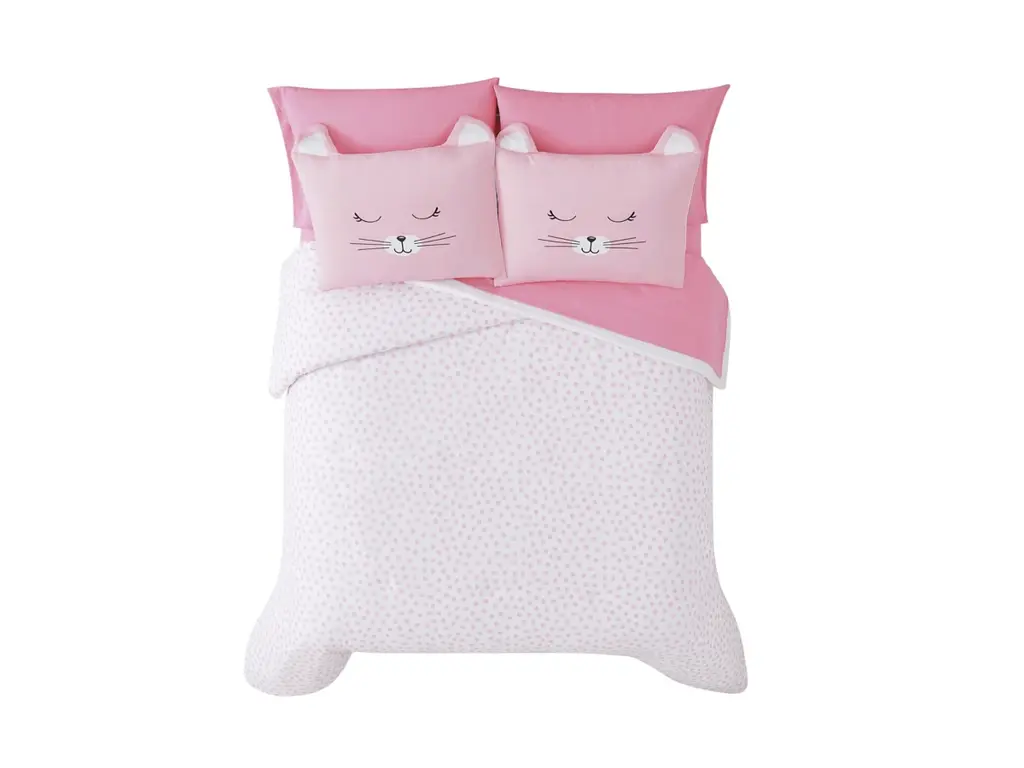A simple polka dot print provides a home for your feline friend in this amusing set that includes all your bed needs. The comforter features a minimal pink-on-white polka dot print with a solid white reverse. The pillow shams feature a sleeping cat face print with attached fabric ears to bring it to life. This set includes sheets and pillowcases in a coordinating pink. All items are made of a microfiber polyester and the comforter has a polyester fill. This set is CPSIA Certified Safe, which means it is lead free and phthalate free so your little one will not just have fun, but also be secure.