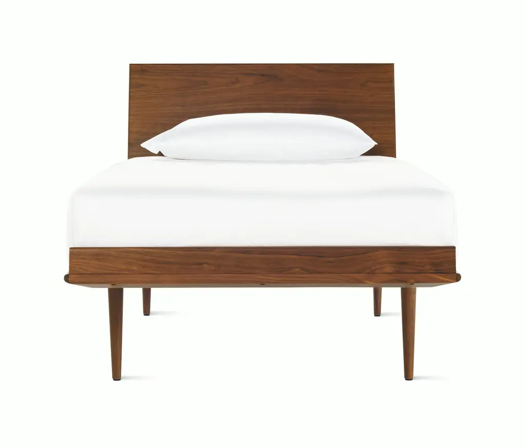 Keeping with George Nelson's vision of pieces that could be adapted for the times, the Nelson Thin Edge Bed (1954) now features slats instead of springs to accommodate memory foam mattresses. Finishes, including walnut and white ash, reflect new technologies and consumer preferences. The headboard is available with or without woven cane; legs may be solid wood or stainless steel. But even with these updates, this unmistakably remains a Nelson bed frame in its simplicity and quiet beauty.