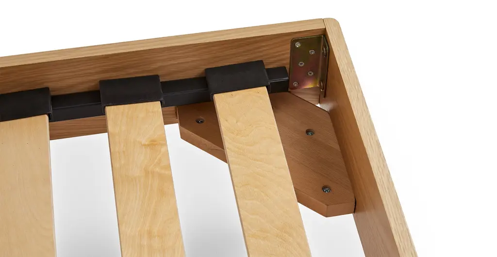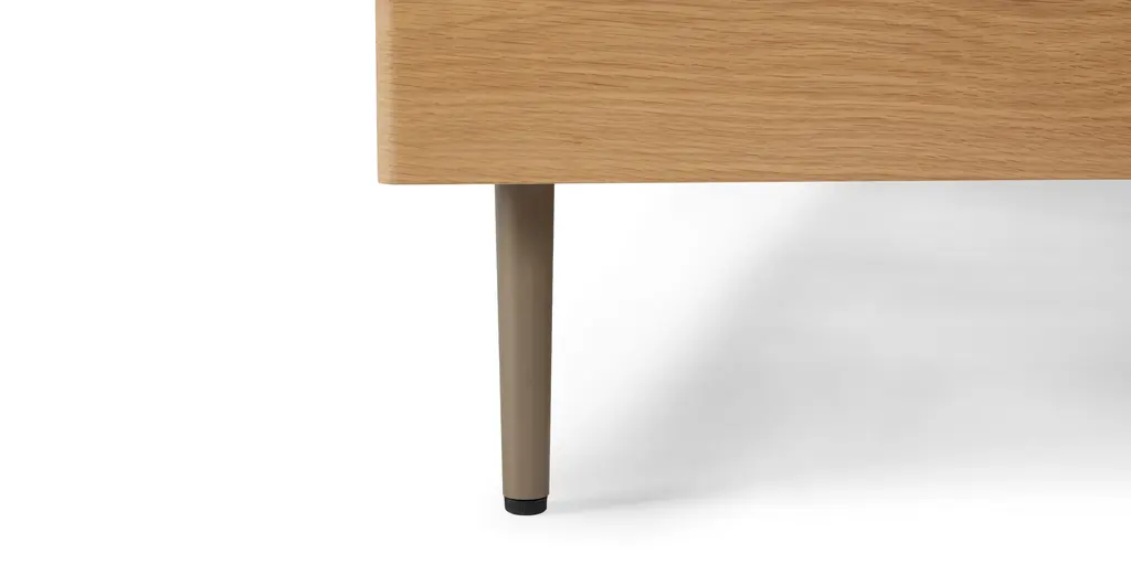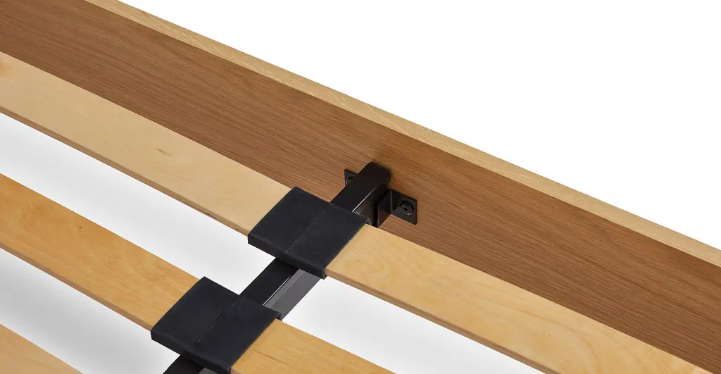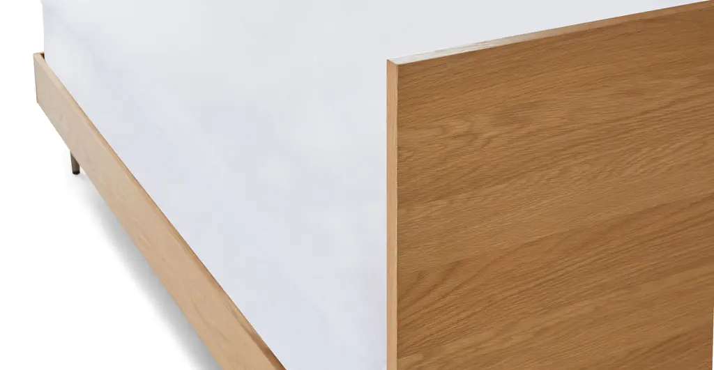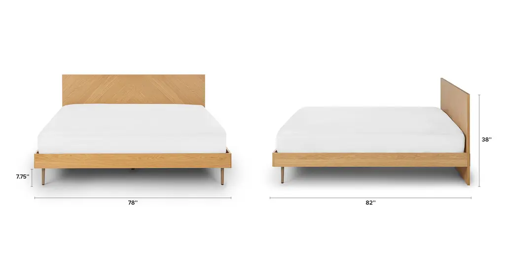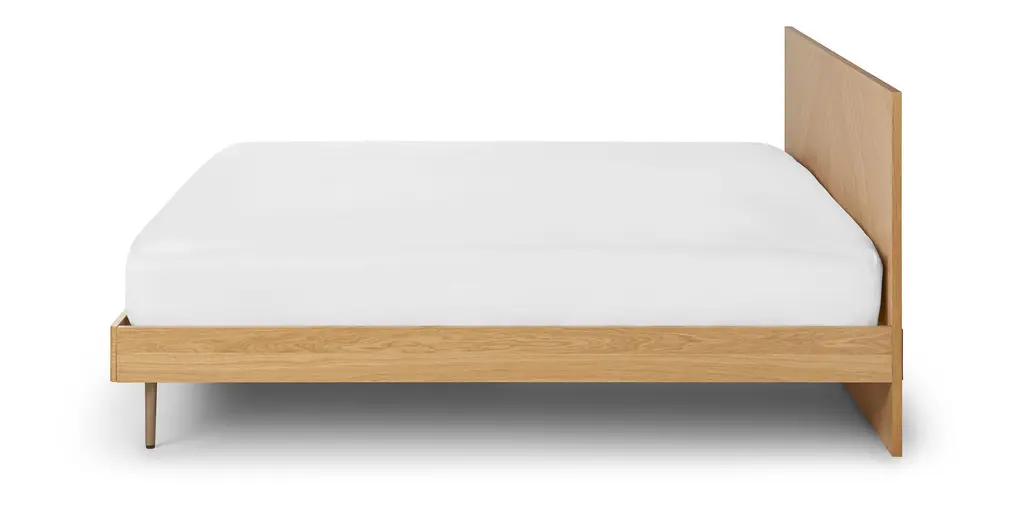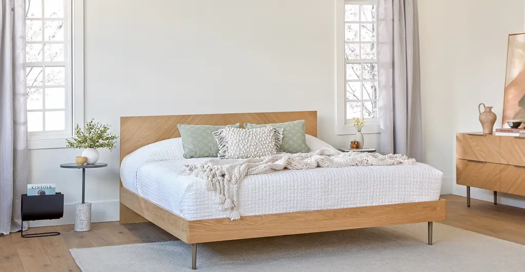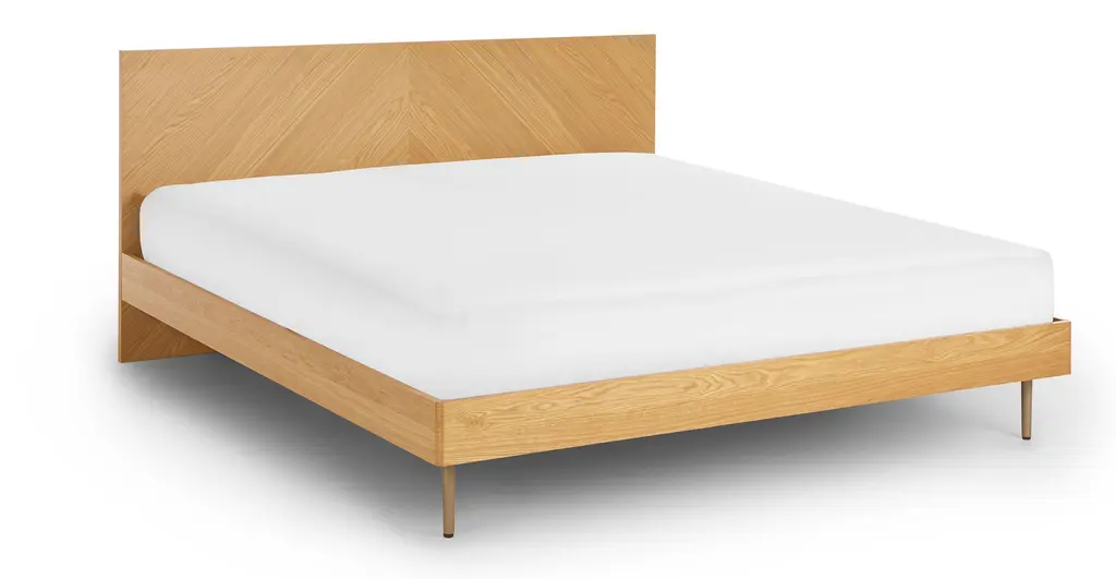Behind closed doors. Designed to peek out from behind the comfort of a pillow-adorned mattress, the headboard of the low-profile Nera Bed, designed with a subtle chevron pattern, brings a natural warmth to any bedroom. Constructed of solid wood and wood veneer, the Nera features two powder-coated steel legs at the foot of the bed for extra stability.