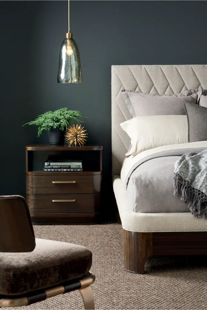 Your bedroom will look quite impressive when this bed is the centerpiece of the room. The neutral tweed upholstered headboard sports a quilted contemporary herringbone pattern that makes a statement on its own. An exposed frame of fumed figured eucalyptus, finished in Aged Bourbon, trims the headboard, footboard and rails that are also bolstered on the top in tweed.