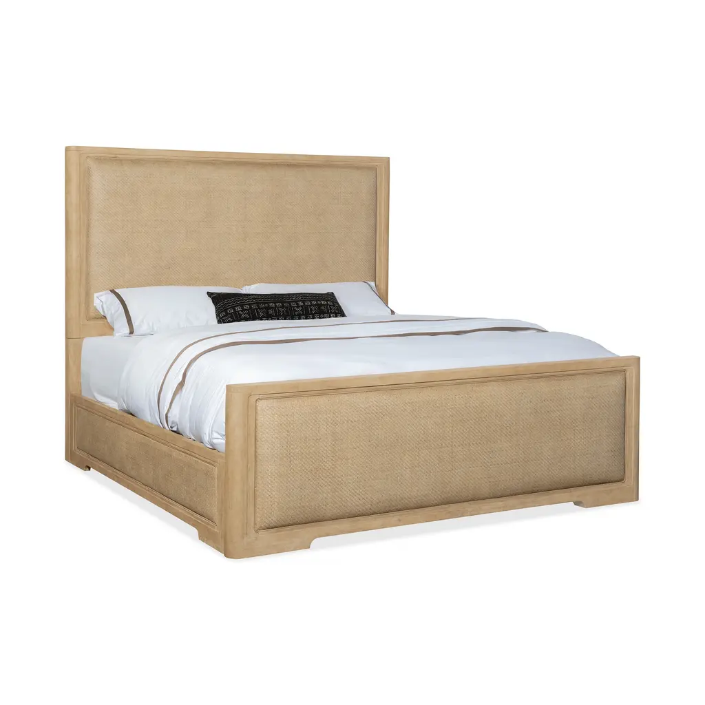 This bed offers a stylish combination of wood and upholstery elements, featuring welted upholstered panels on both the headboard and footboard. The design is offered as a complete bed with wooden side rails.